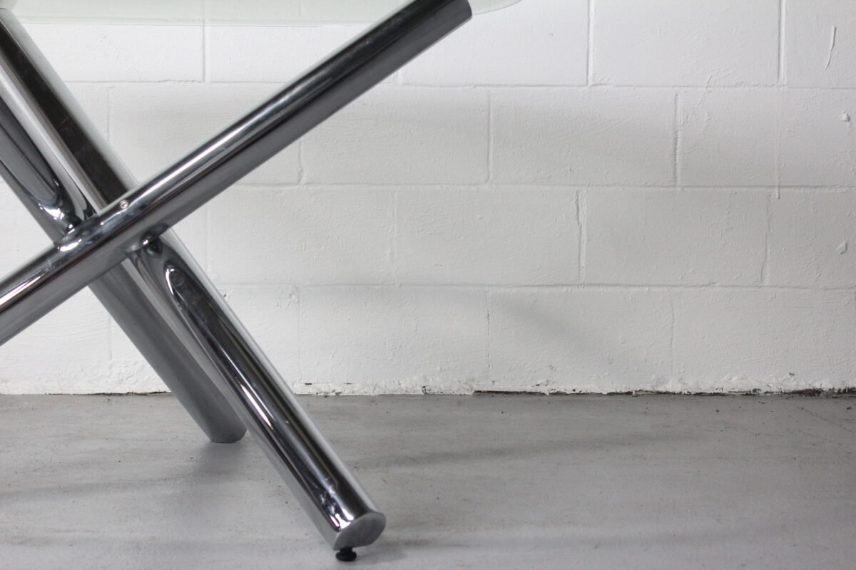 Add a touch of modern sophistication to your workspace or social area with this stunning 48″ Round Glass Table. The tempered glass top gives it a sleek, airy presence while the durable chrome X-base offers stability and eye-catching style.