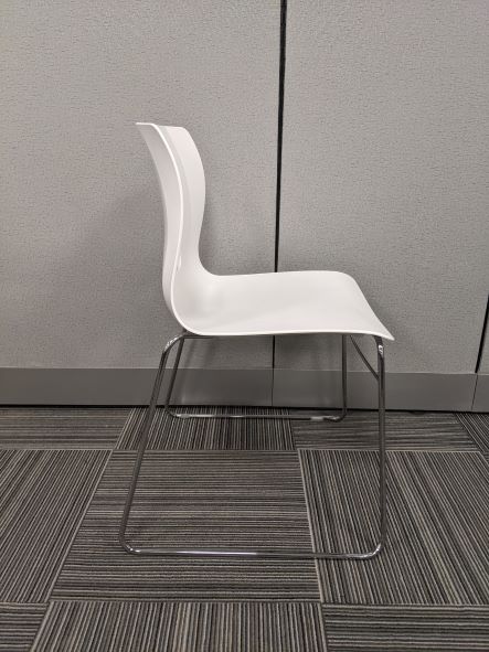 Allermuir Casper chair with white molded seat and chrome sled base. Stackable, modern guest seating for office or café use.