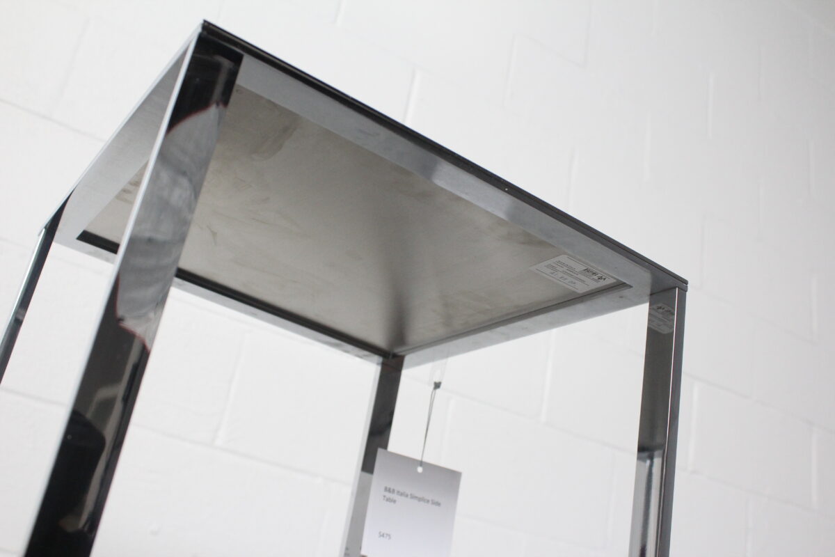 B&B Italia Simplice Side Table featuring a chrome frame and stainless steel top. Modern, minimalist, and perfect for office or home.