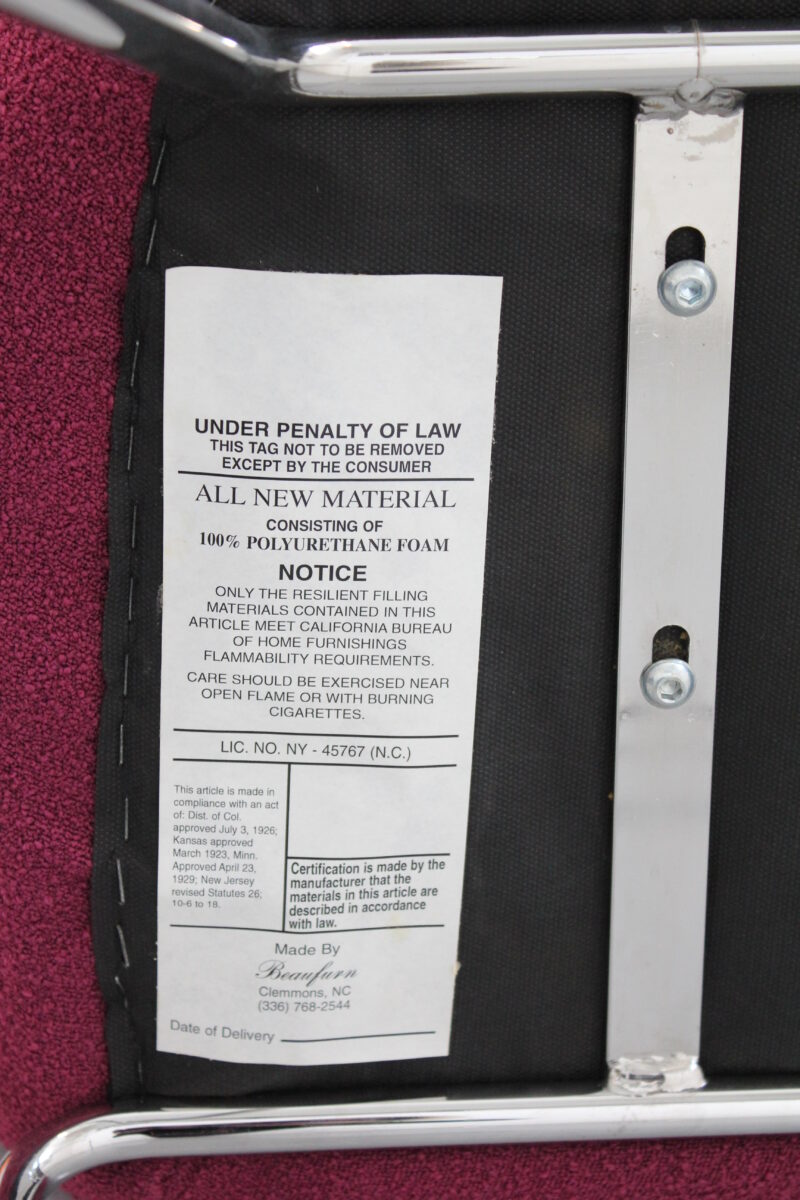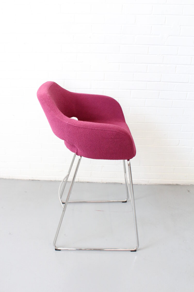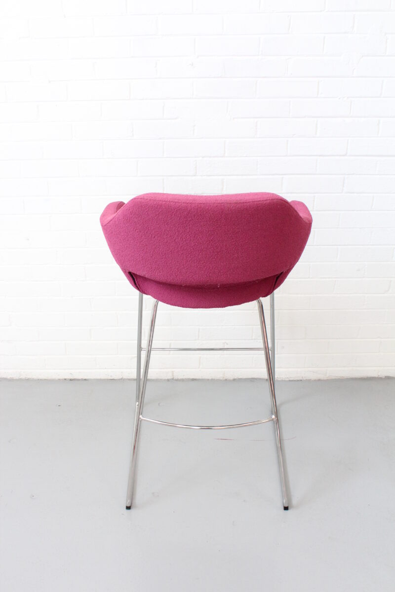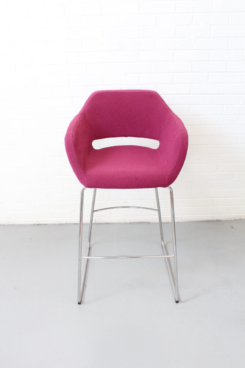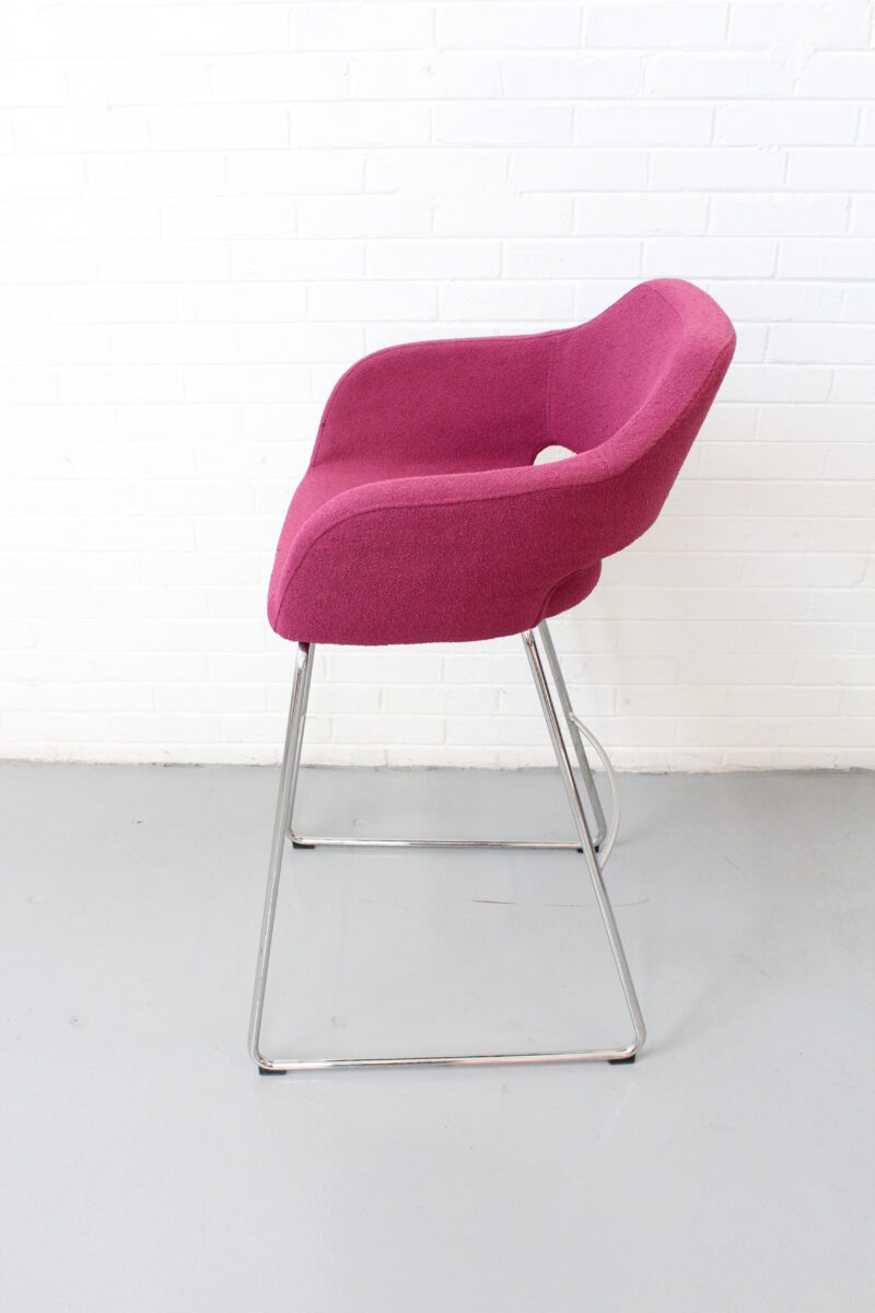 Pre-owned Beaufurn Larsen Barstool with magenta upholstered seat, sleek chrome sled base, and contoured backrest. Sold as-is.