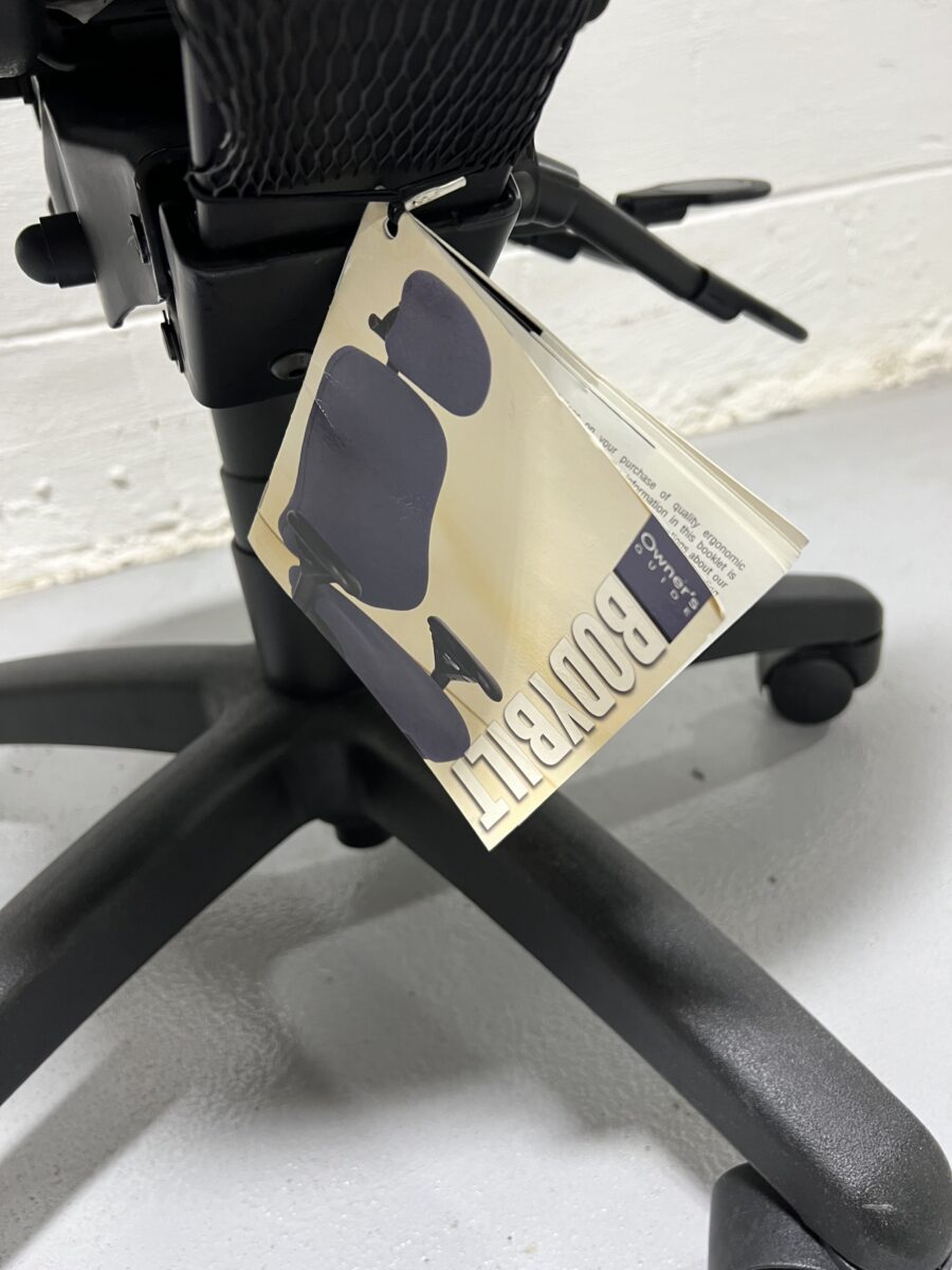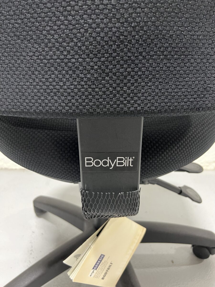 Pre-owned BodyBilt Armless Ergonomic Task Chair with black mesh upholstery and full ergonomic adjustability, ideal for compact or collaborative office spaces.
