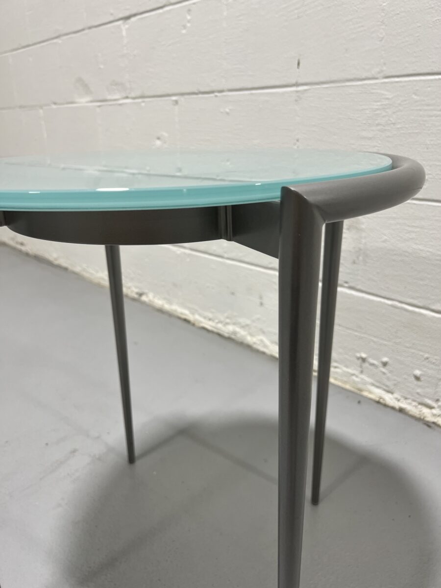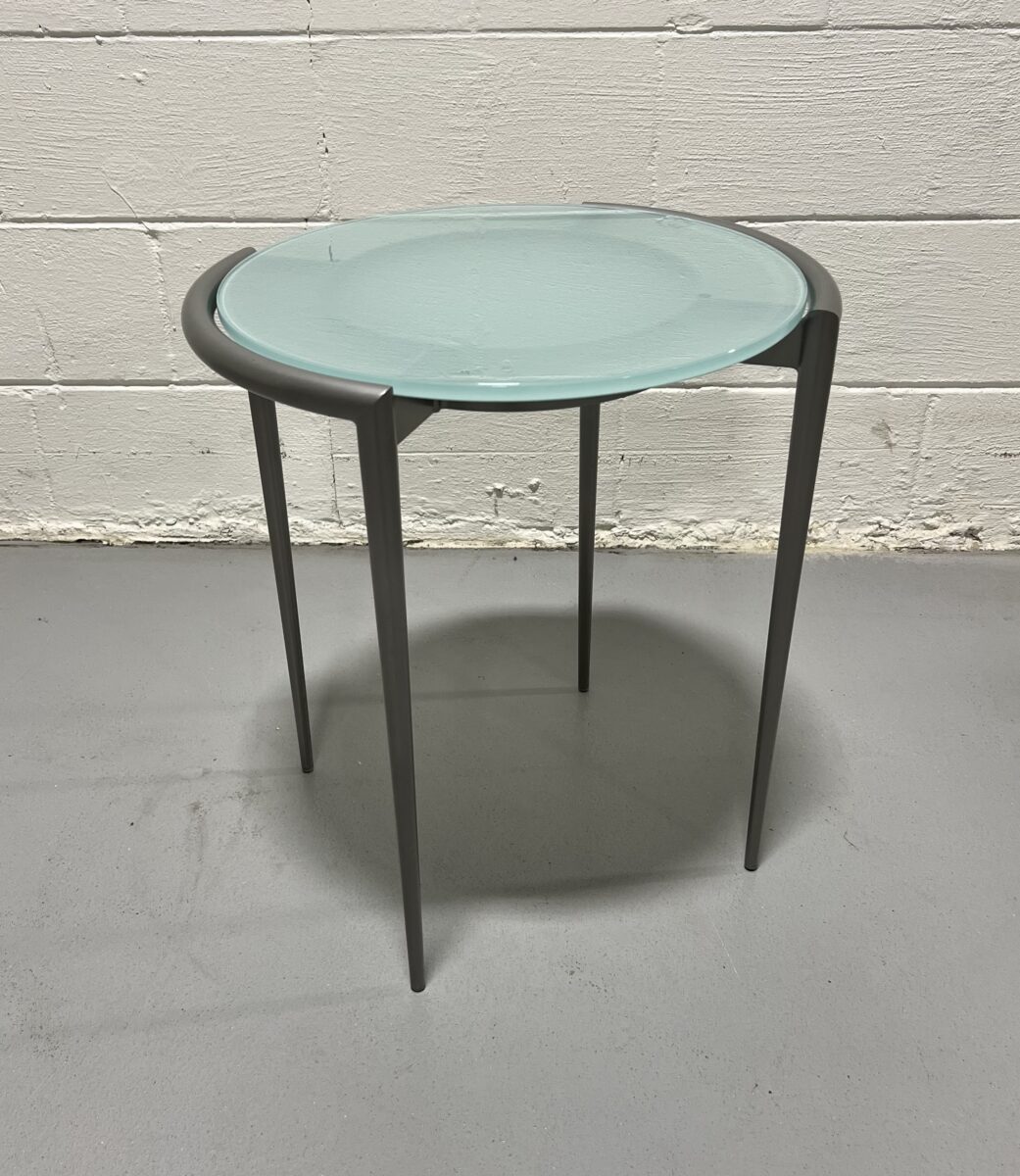 Add a refined and contemporary touch to any office or living space with this Bernhardt Design side table. Featuring a frosted glass top and sleek bronze tapered metal legs, this compact table blends minimalism with elegance. Ideal as a side or accent table, it’s a great fit for both professional and residential environments.