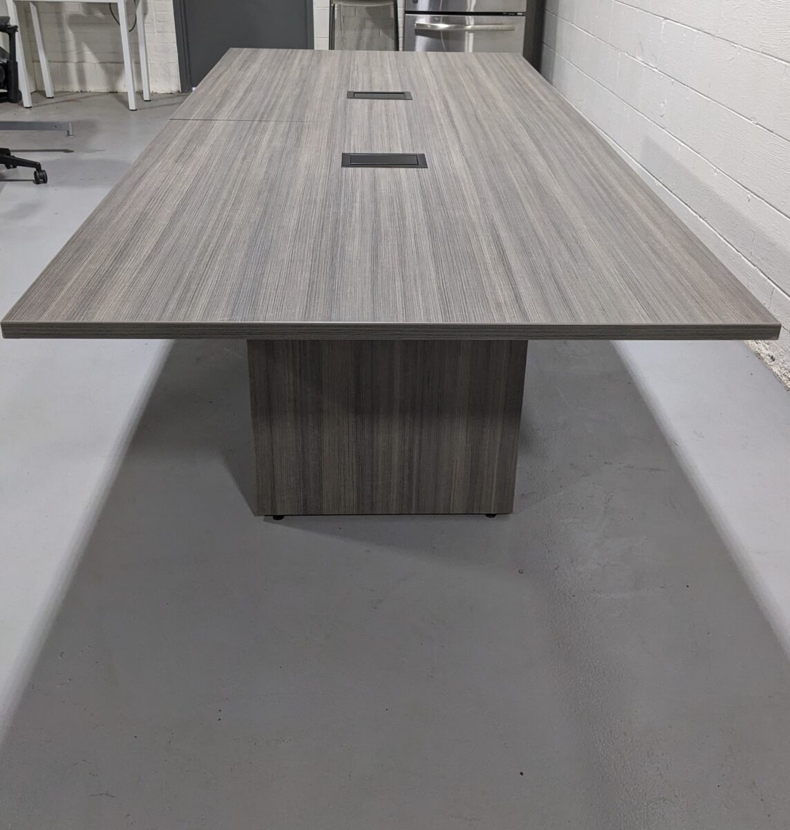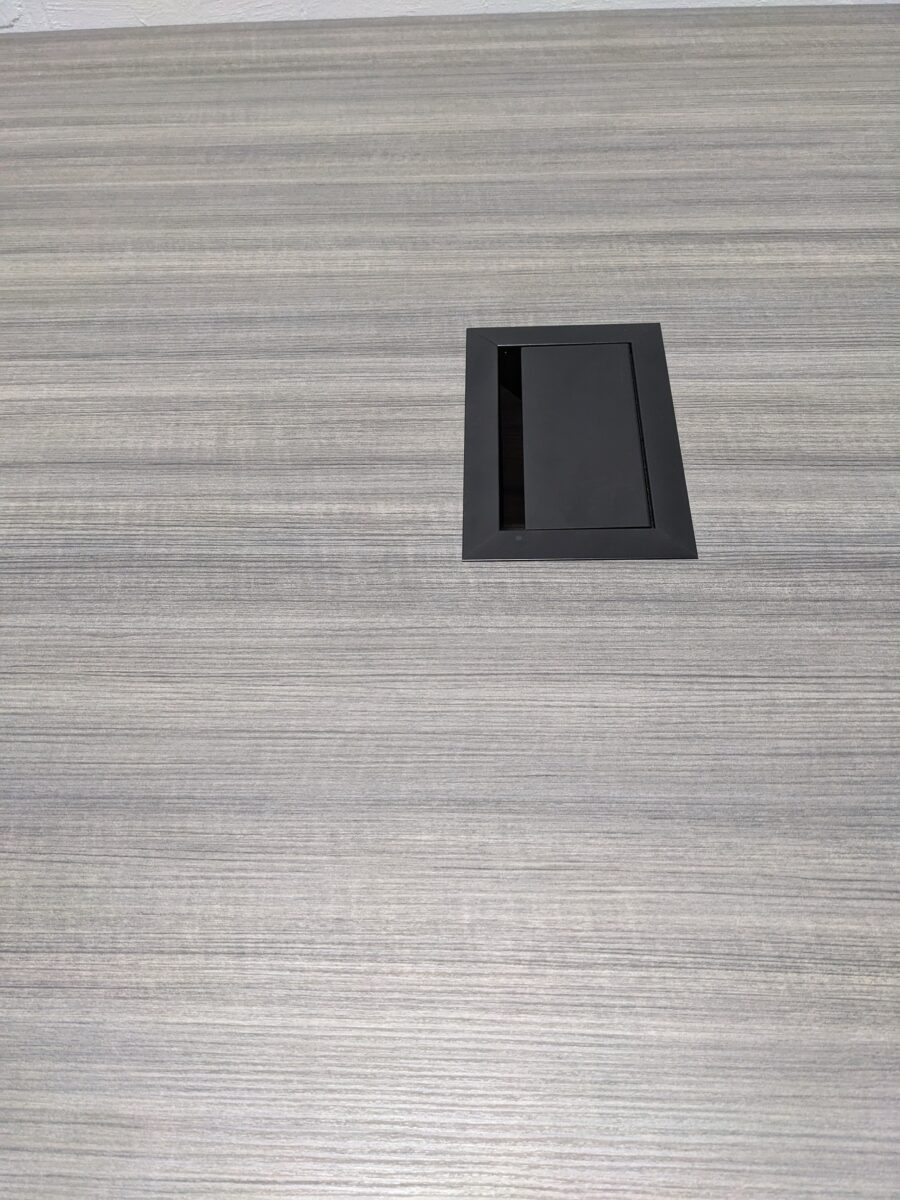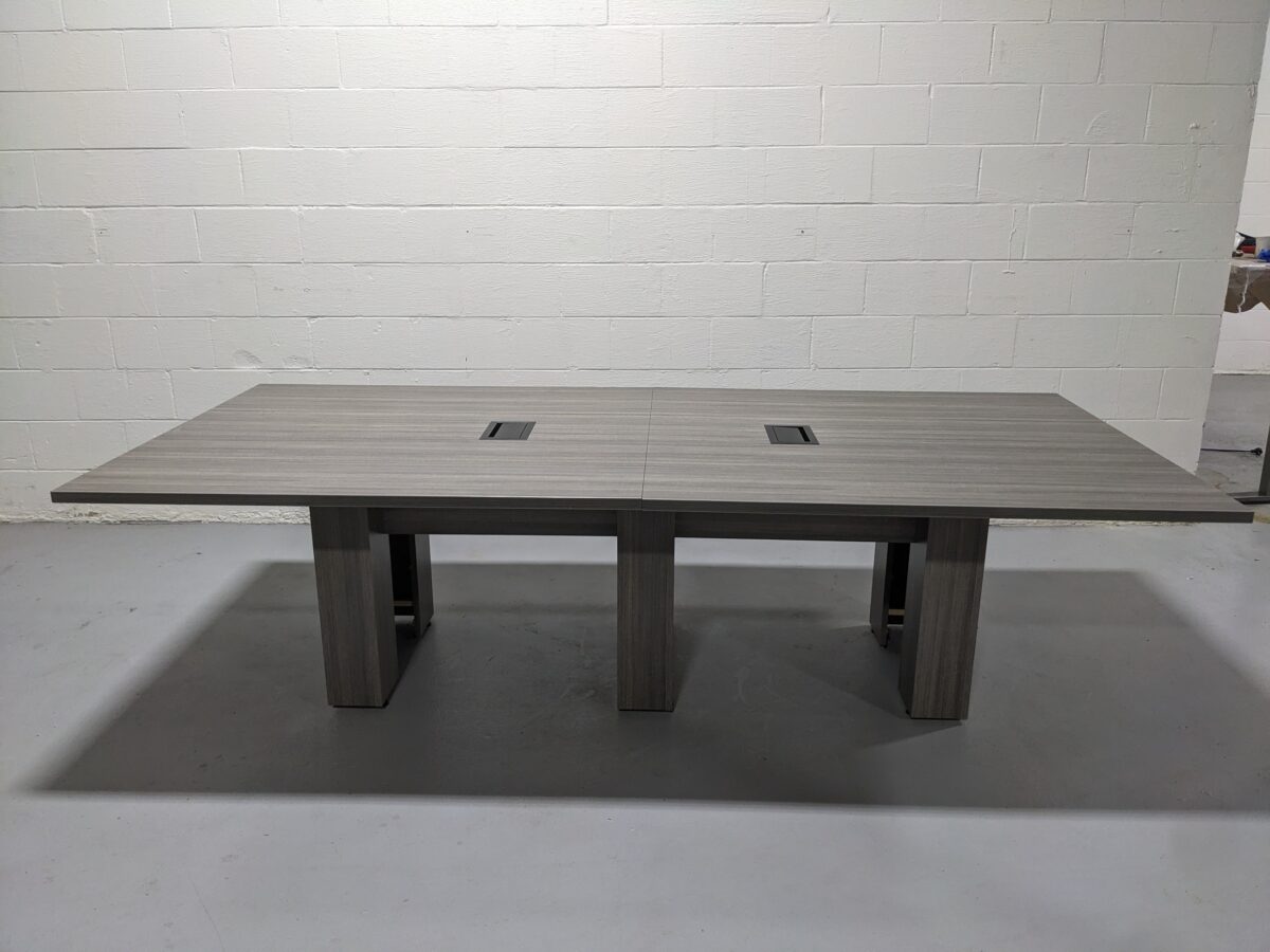 Designed for functionality and modern appeal, this Enwork 9-foot conference table features a two-piece grey woodgrain top with sleek black metal grommets on each half for seamless cable pass-through. Built for power and performance, the table includes three panel bases with integrated through-access for hardwired power, making it ideal for meetings, collaborative work, and executive discussions. Durable and refined, this piece elevates any conference room or team workspace.
