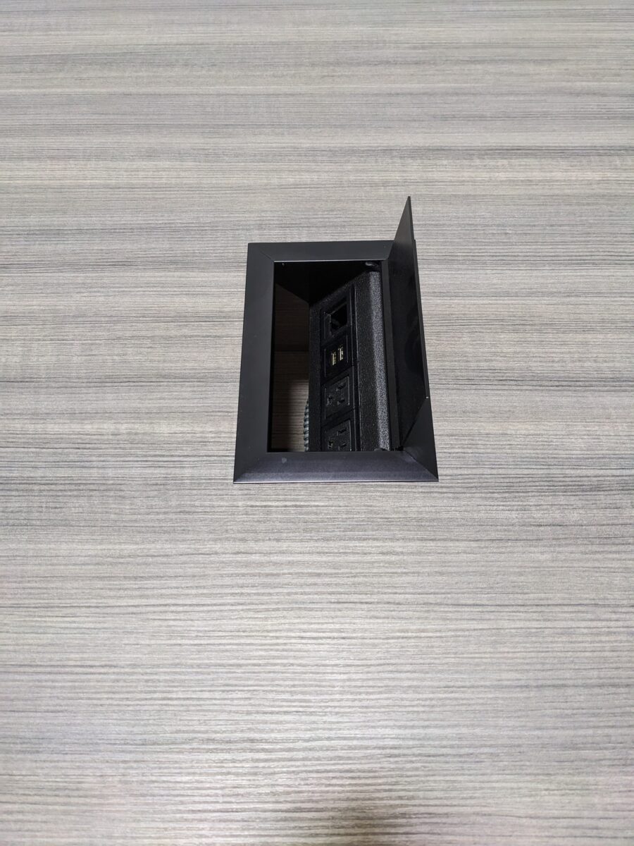 9′ x 4′ Enwork conference table with grey woodgrain top, 3-panel base, and dual grommets for integrated power access.
