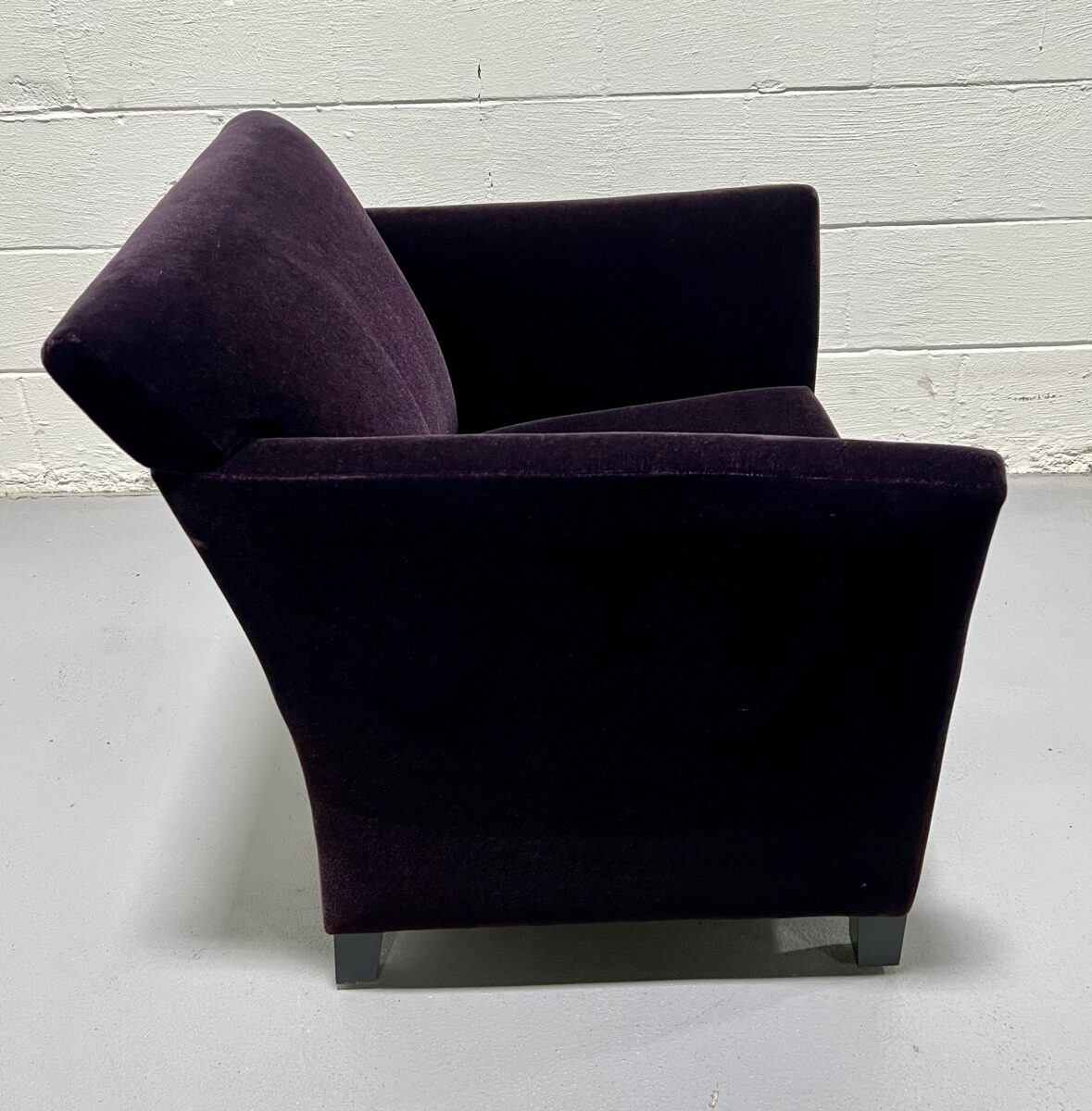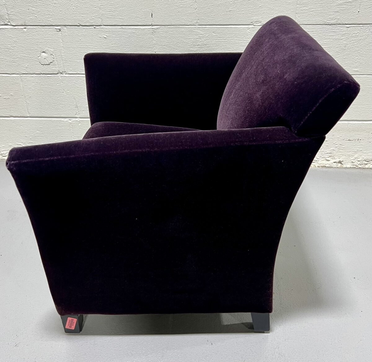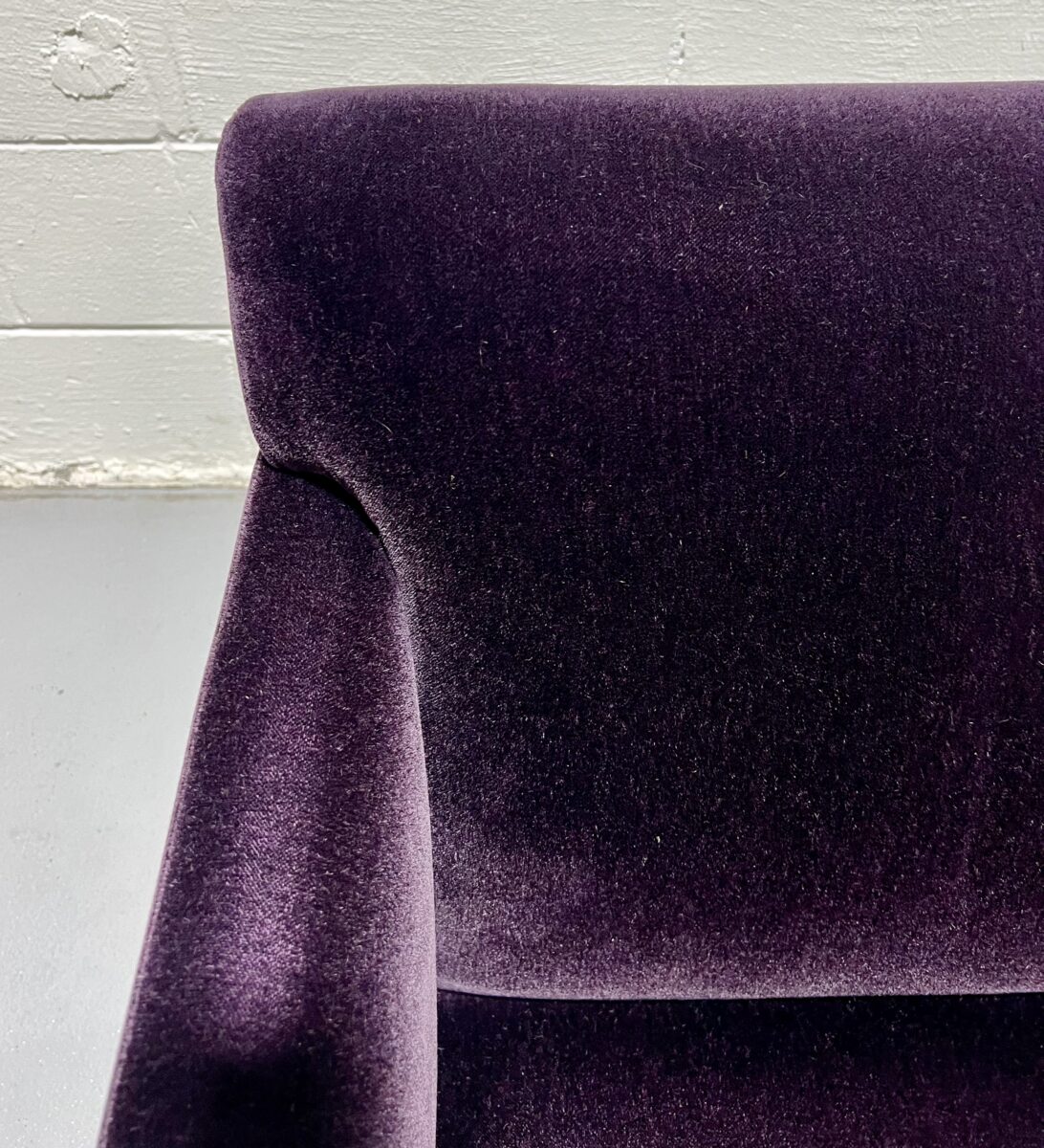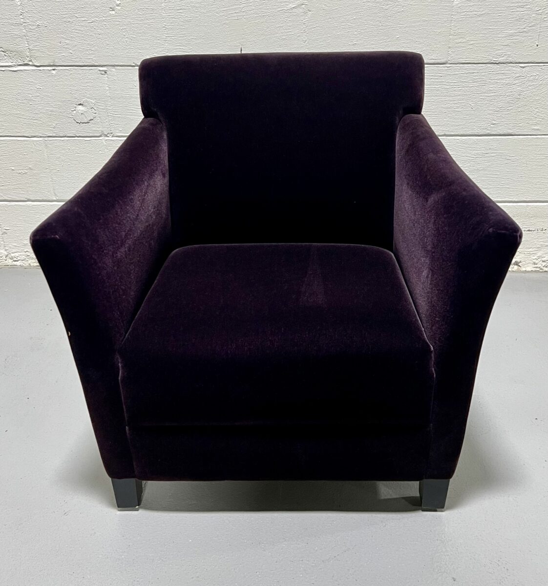 Make a statement with this luxurious Geiger Brickel armchair in deep purple velvet, modern, plush, and perfect for any stylish lounge or waiting area.