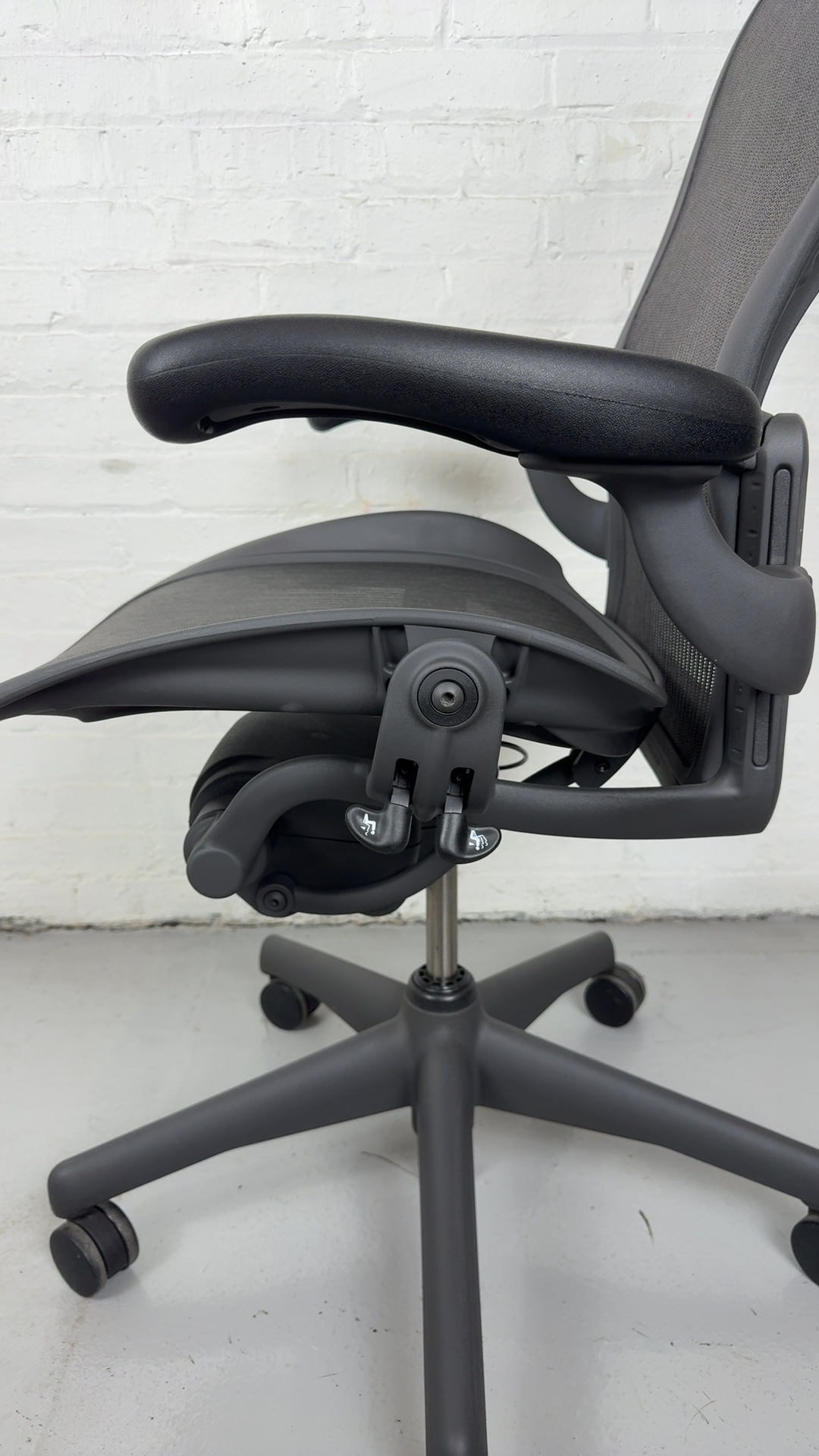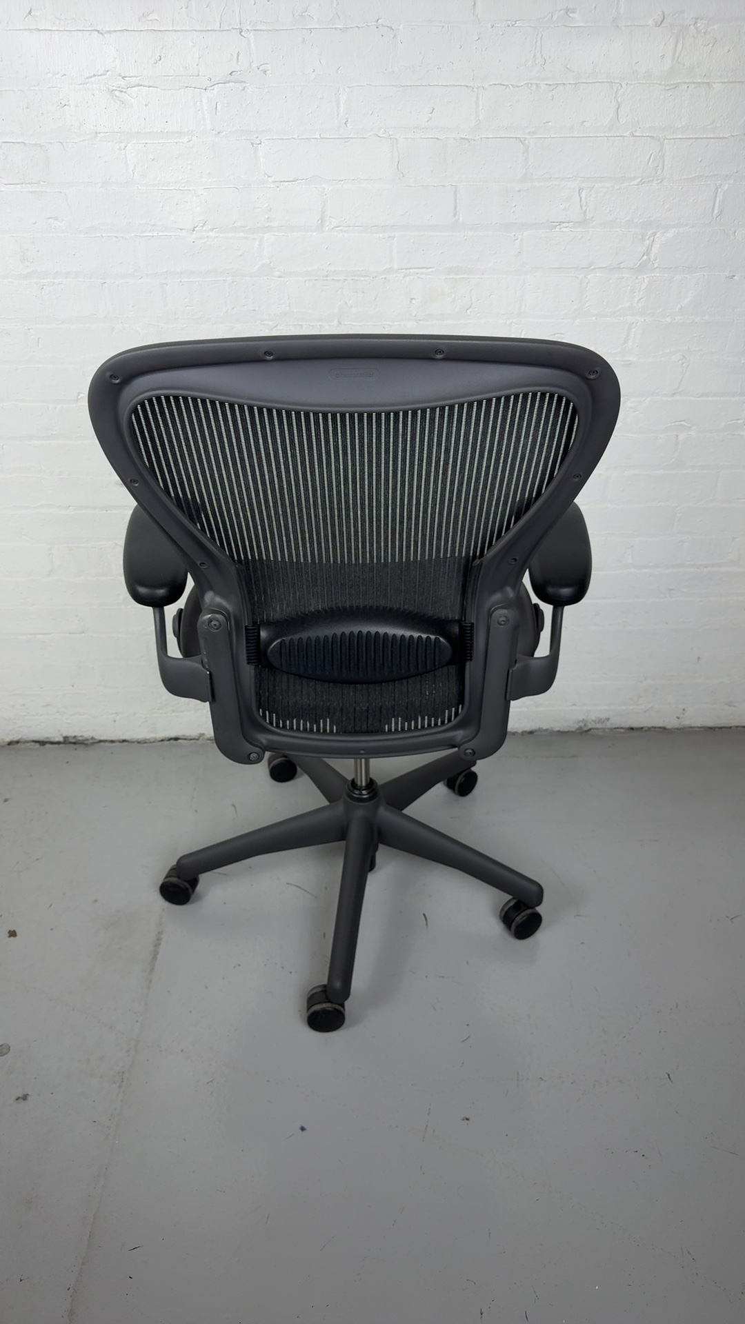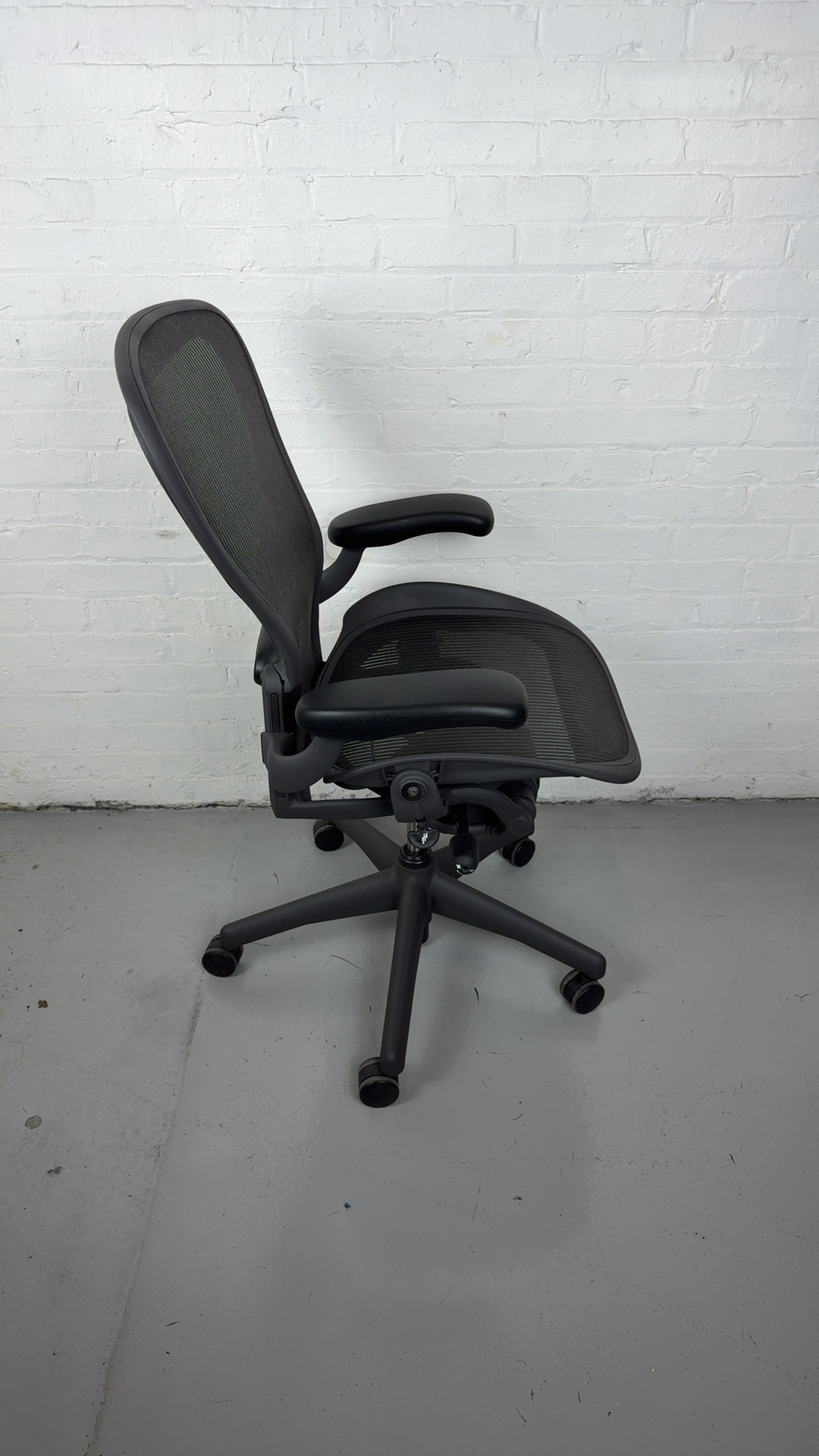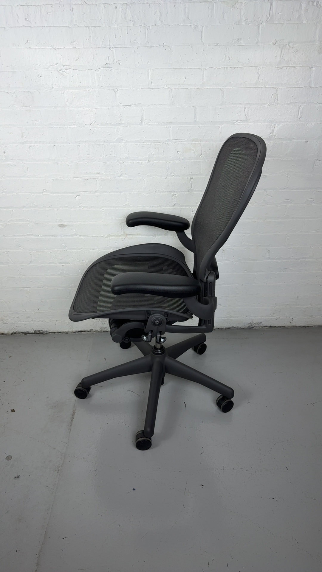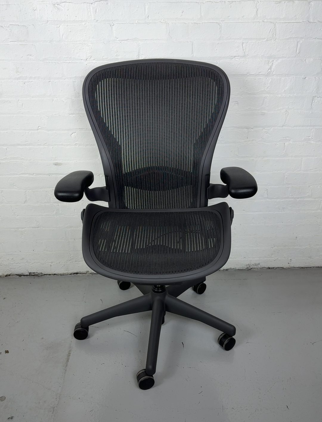 Herman Miller Aeron Chair, Size C with fixed arms and graphite frame. The ergonomic gold standard in comfort and support for modern workspaces.