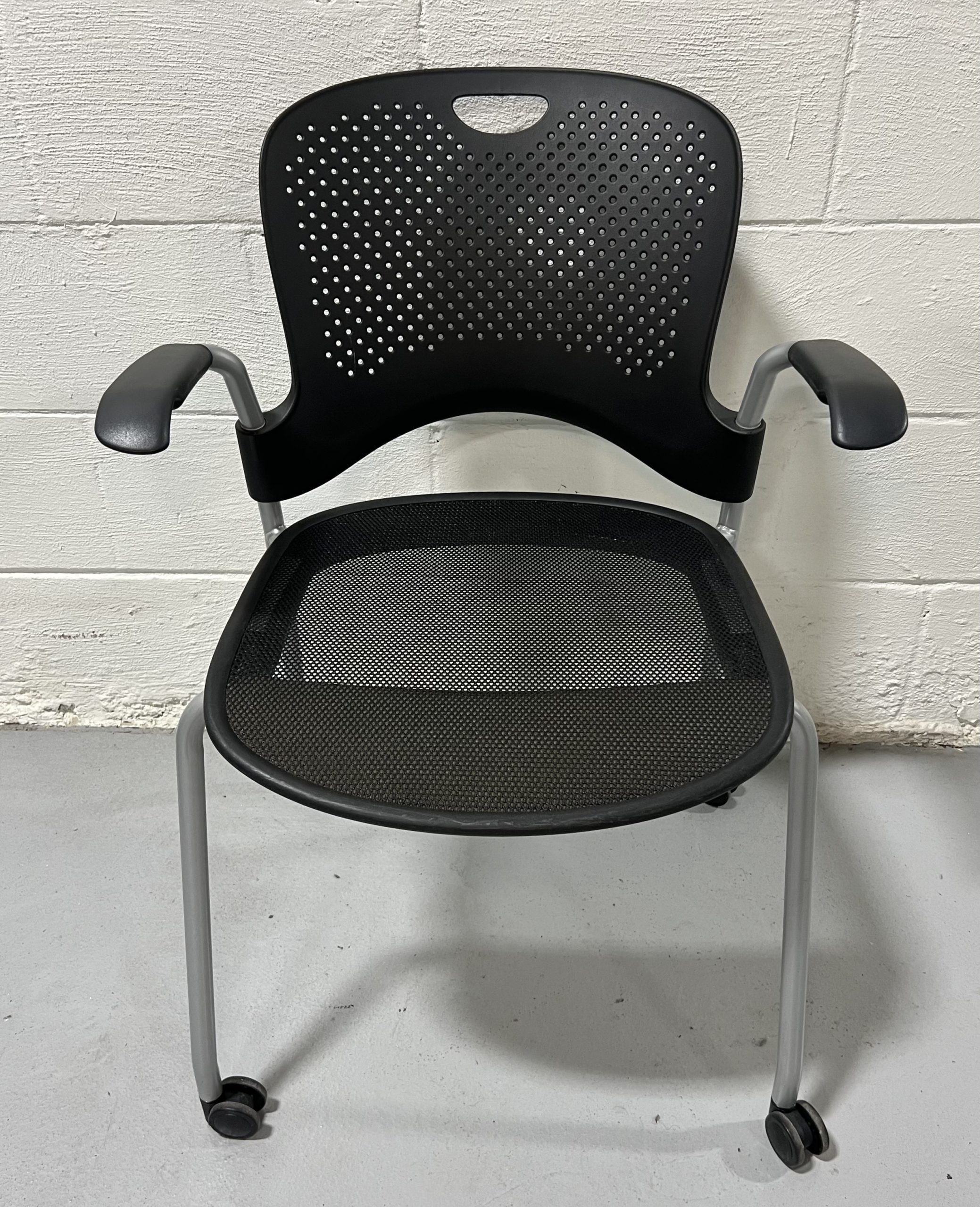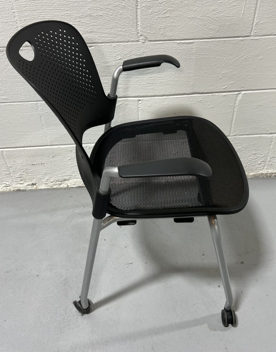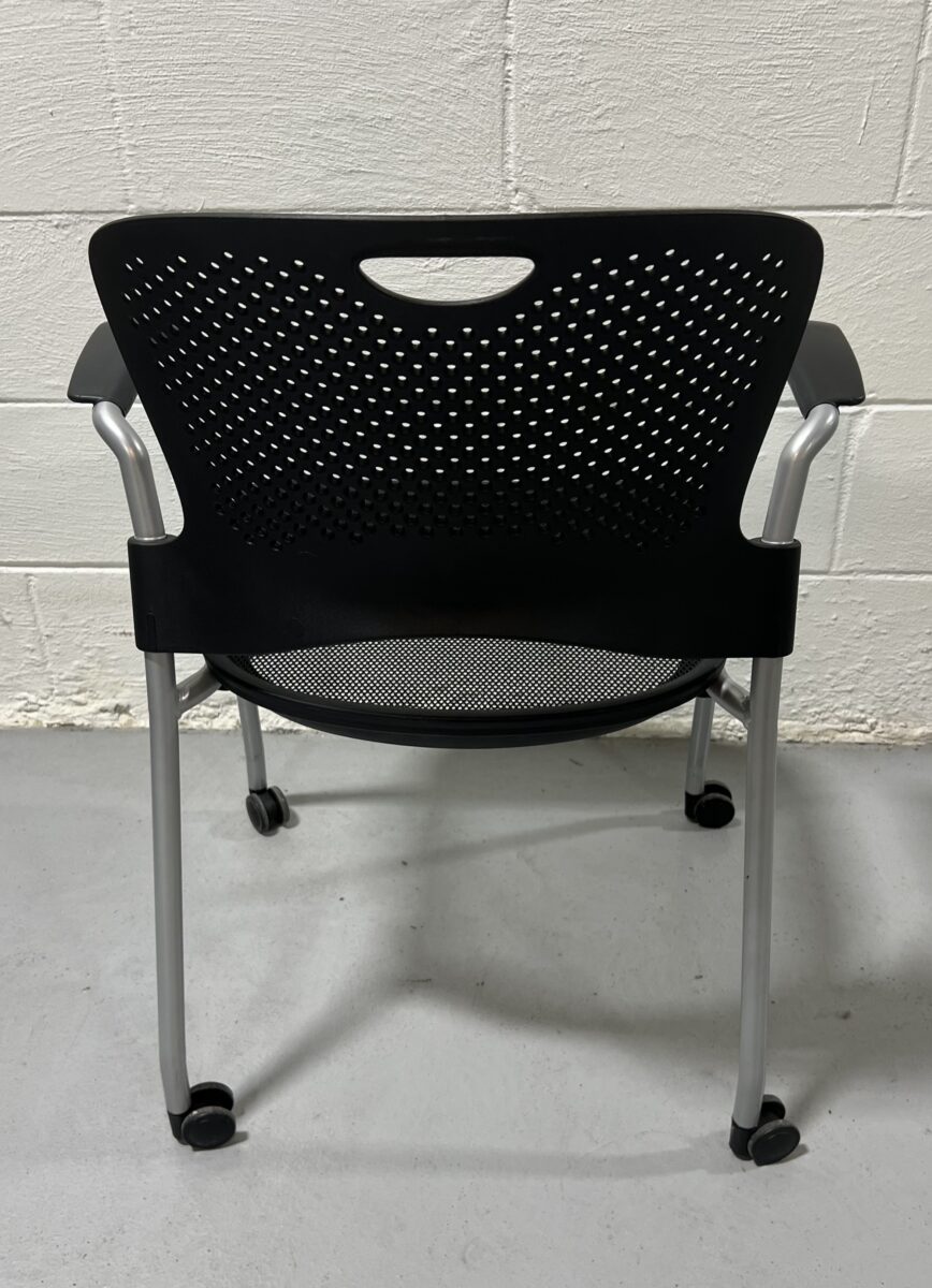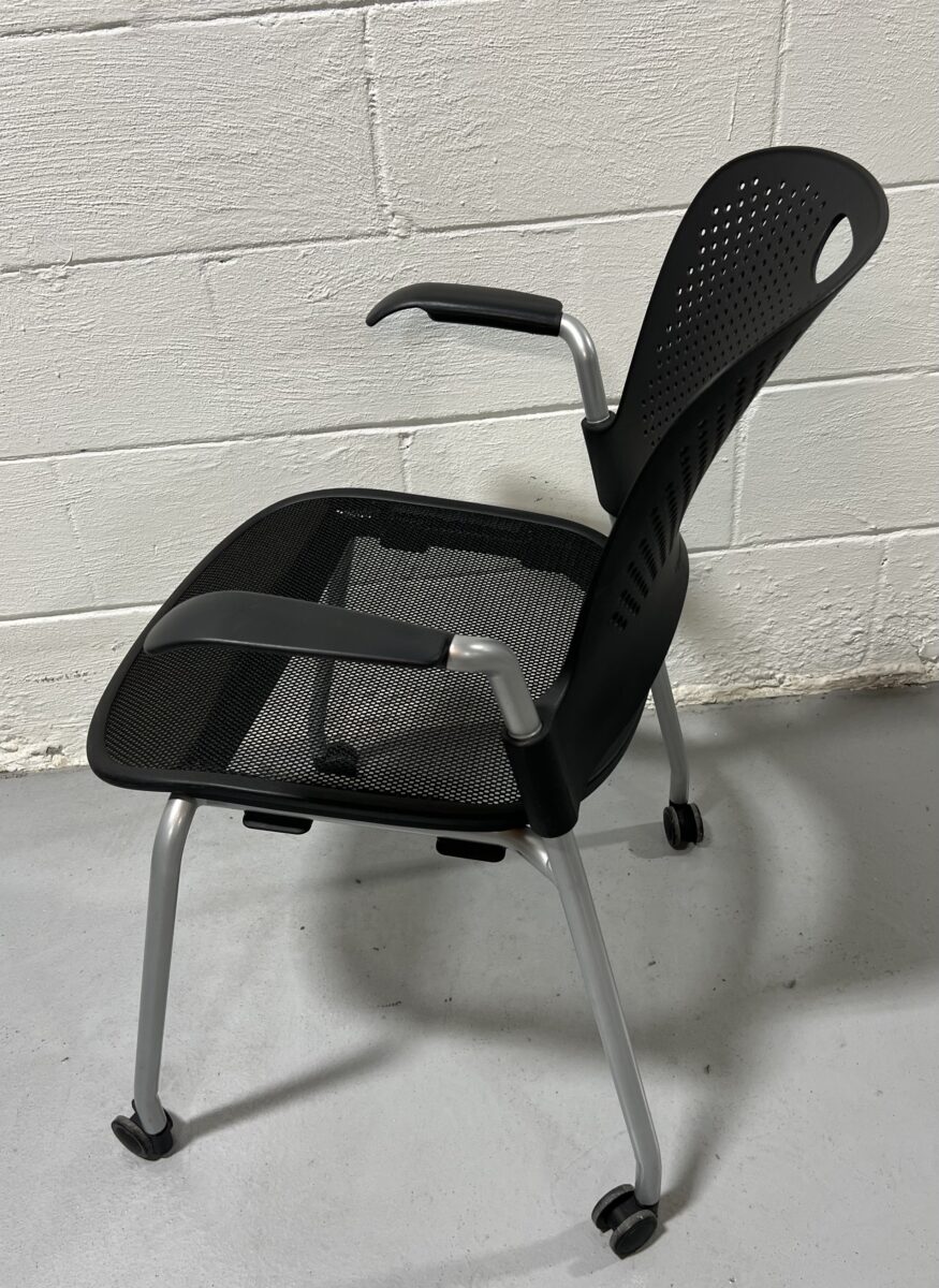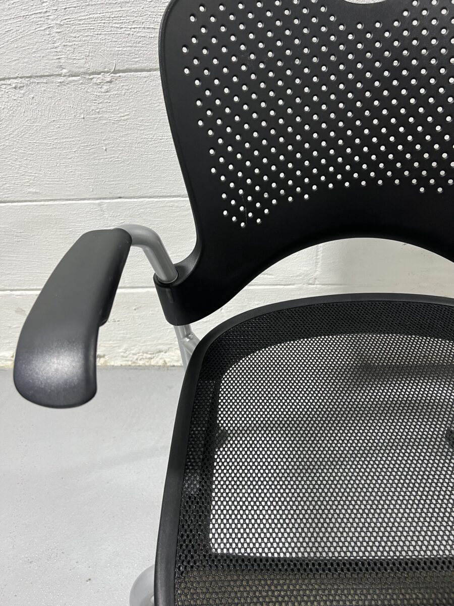 Pre-owned Herman Miller Caper stacking chair with arms, black mesh seat, perforated back, and mobile base, stackable and ergonomic for flexible office use.