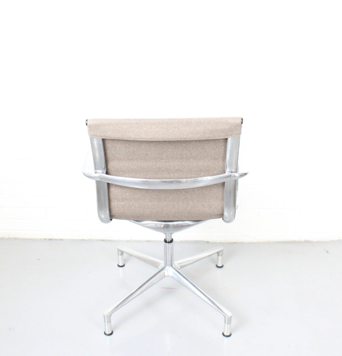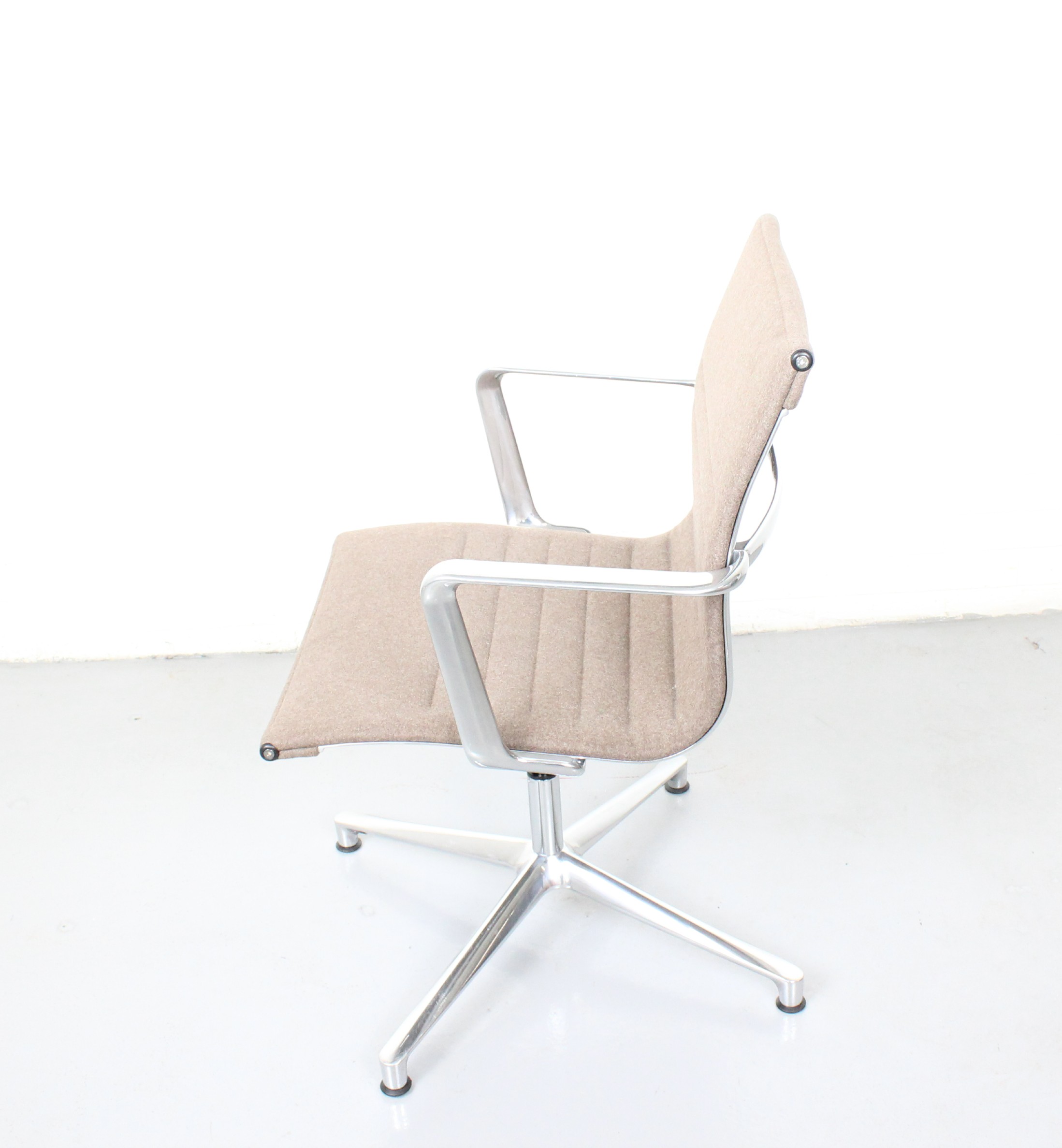 A sleek reproduction of the Herman Miller Eames Soft Pad Chair in taupe wool with a polished chrome base, modern comfort meets timeless design.