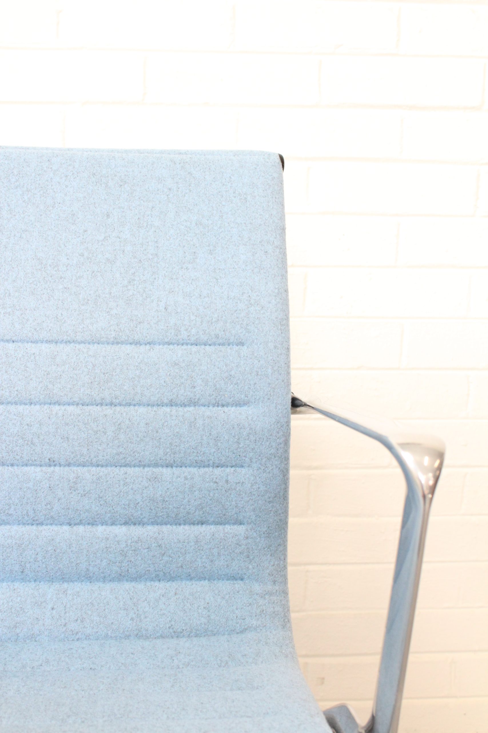 Add mid-century modern flair to your workspace with this Herman Miller Eames-style reproduction swivel chair. Upholstered in a soft light blue wool-like fabric, this chair offers a minimalist profile, ribbed stitching, and sleek polished aluminum arms and base. The 360-degree swivel and sturdy star base provide ergonomic support and style in one, making it perfect for home offices, conference rooms, or creative spaces. Preowned and sold as-is, this chair pairs iconic design with sustainable purchasing.