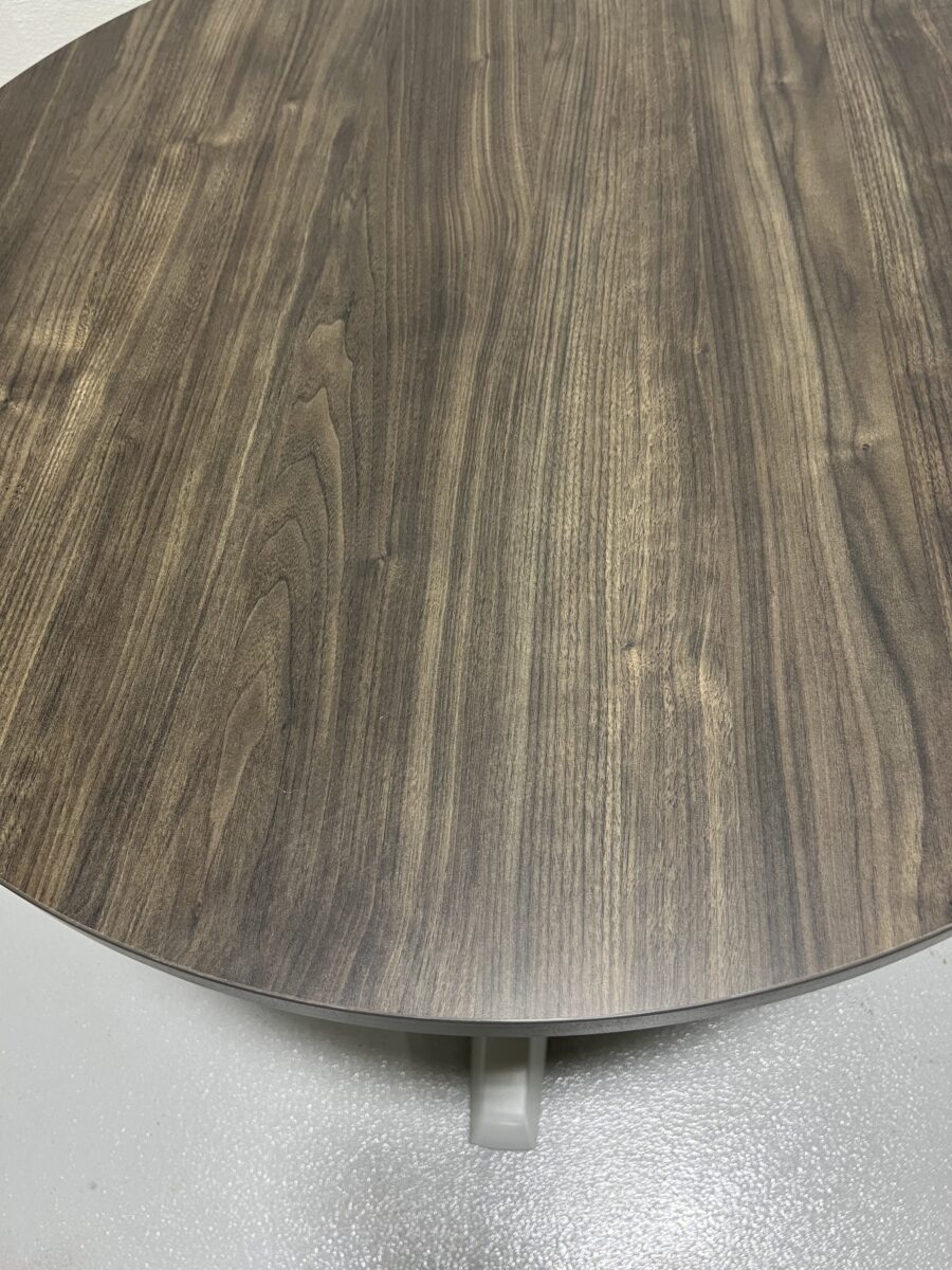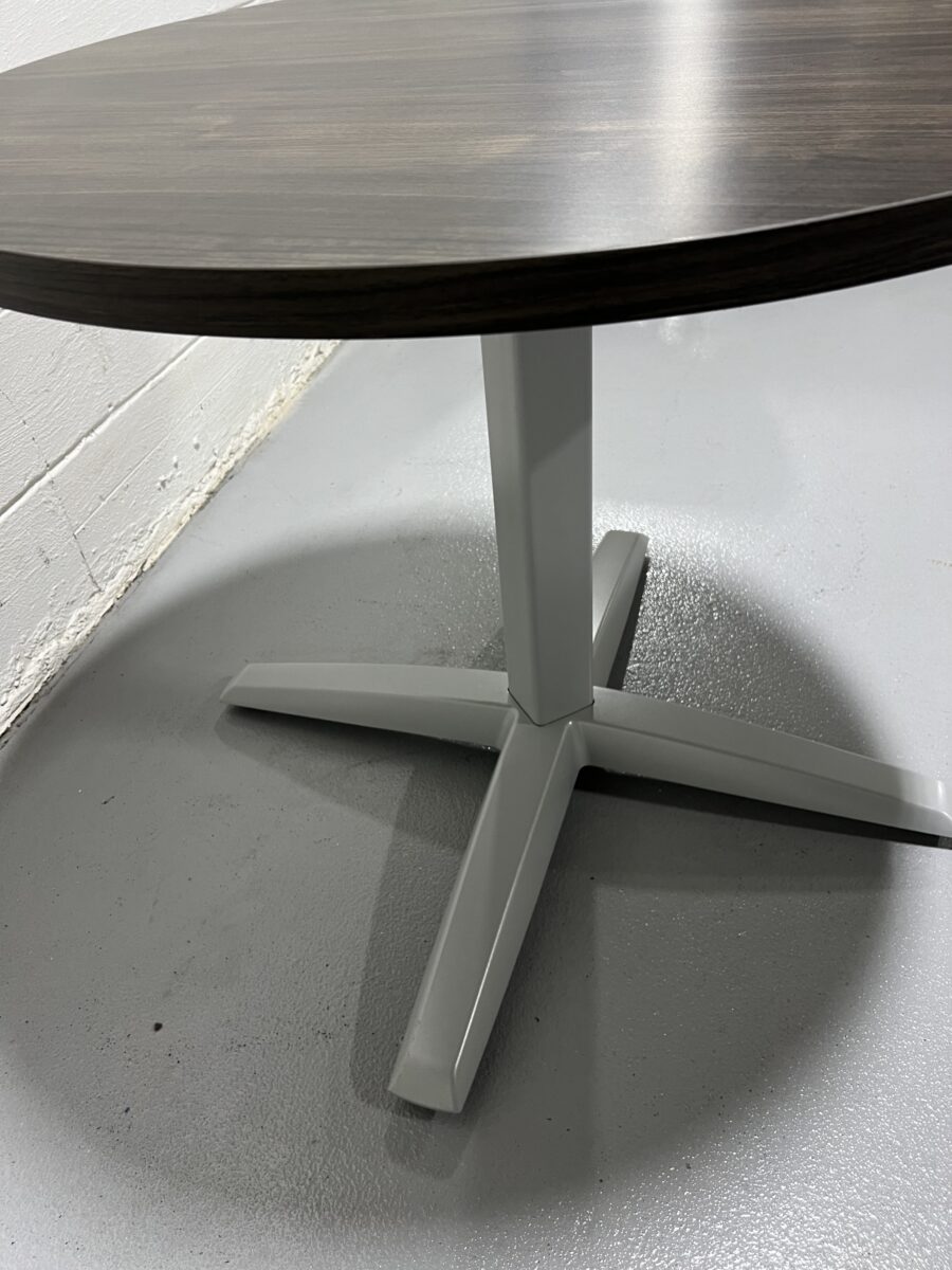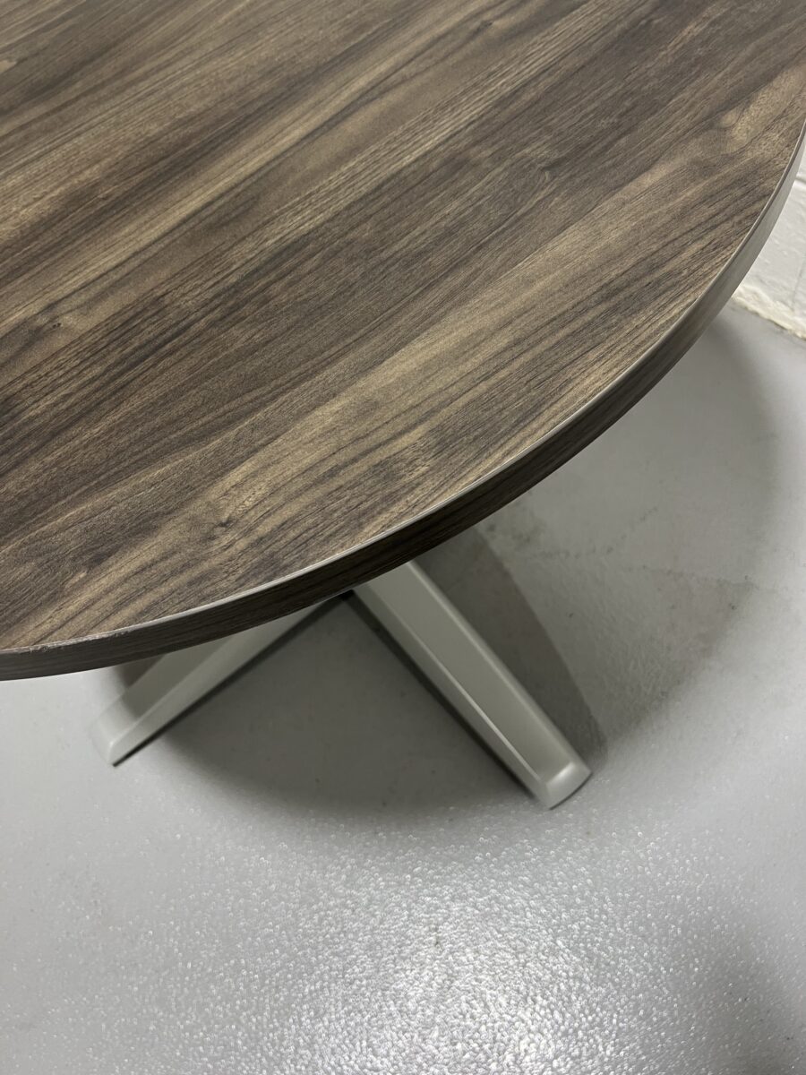 Preowned HON Preside Round Meeting Table with woodgrain laminate top and sleek silver X-base, perfect for team huddles and modern office spaces.