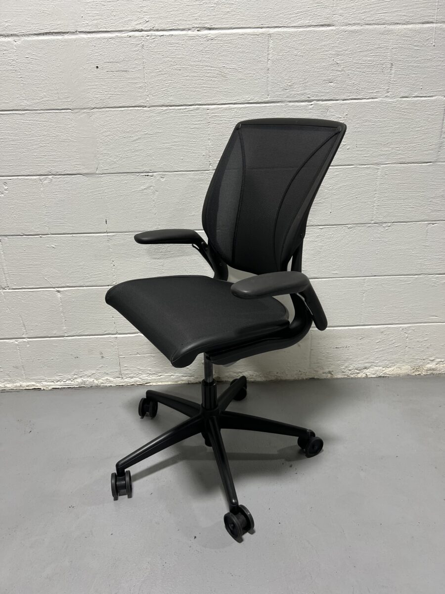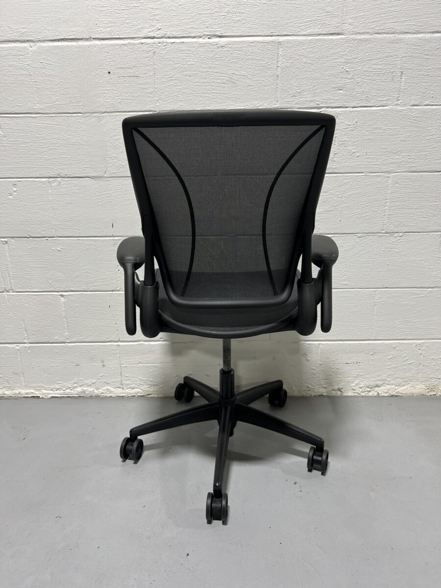 Upgrade your office setup with the sleek and ergonomic Humanscale World One Task Chair in black mesh. Designed for simplicity and high performance, this preowned chair offers a weight-sensitive recline, form-sensing mesh technology, and intuitive functionality without manual knobs or levers. The World One is a streamlined, sustainable task chair created to bring Humanscale’s ergonomic innovation to a wider audience. It features a breathable mesh back and seat, adjustable arms, and a sturdy black frame with a 5-star caster base for easy mobility. Perfect for long workdays and minimalist workspaces.