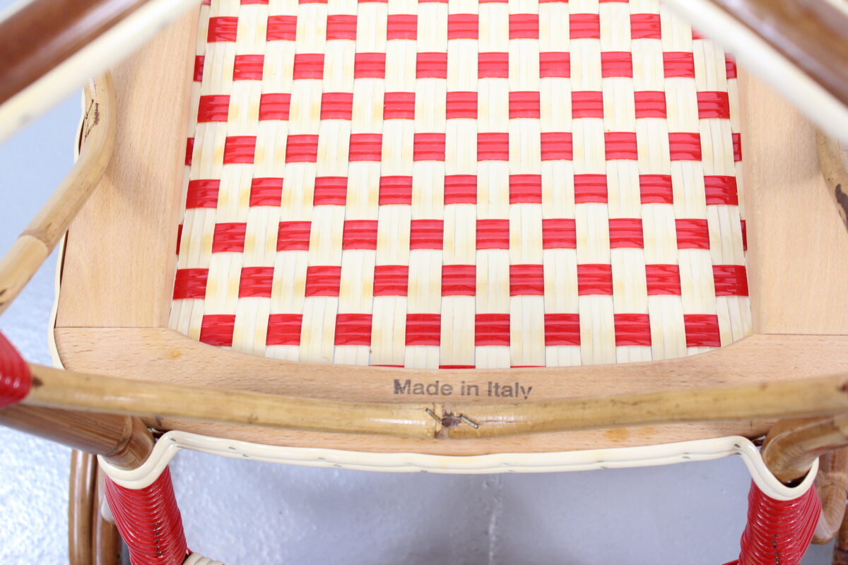 Pair of vintage red and cream woven rattan dining chairs made in Italy. Café-style charm meets comfortable function in this vibrant set.