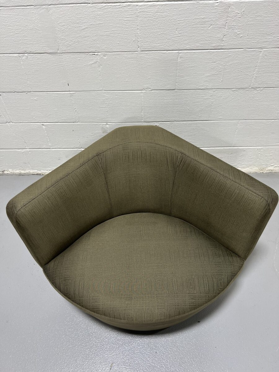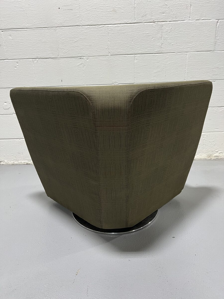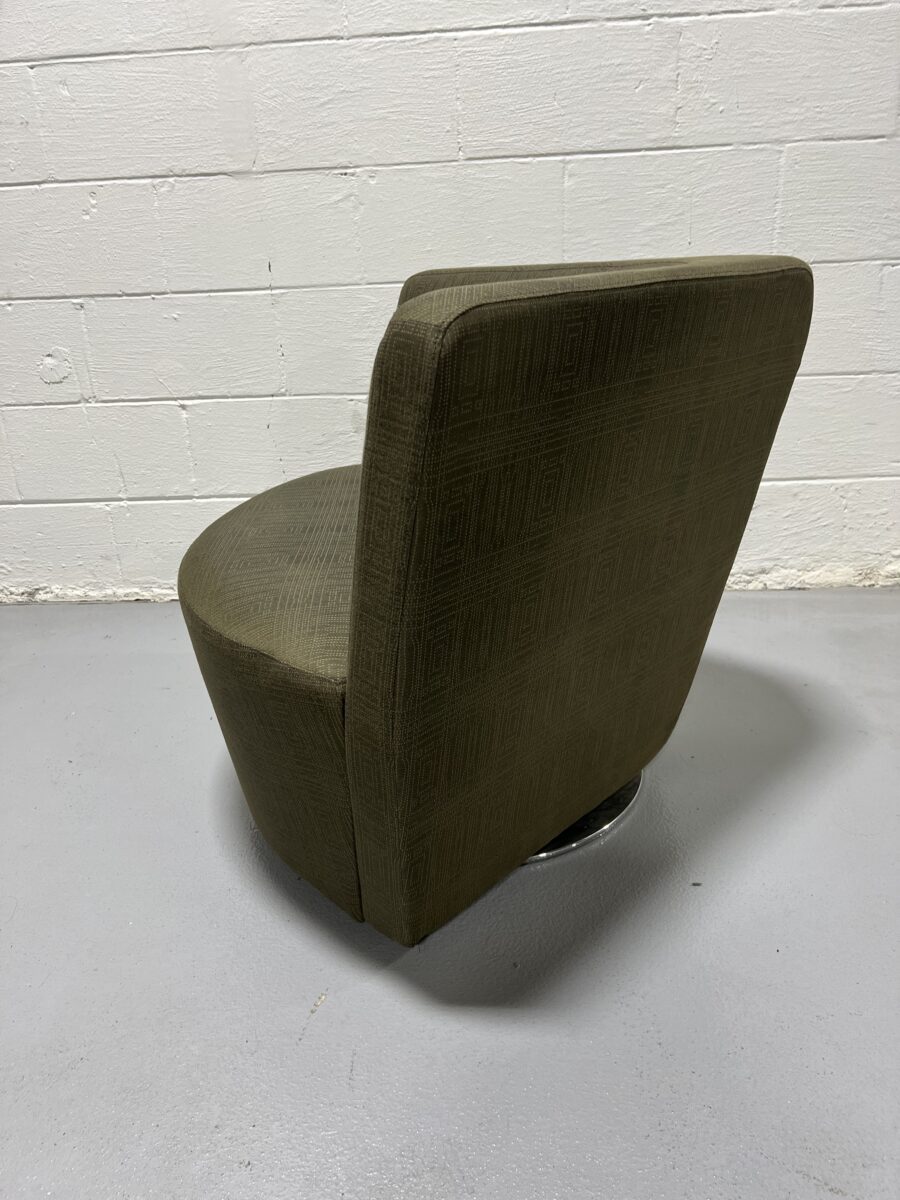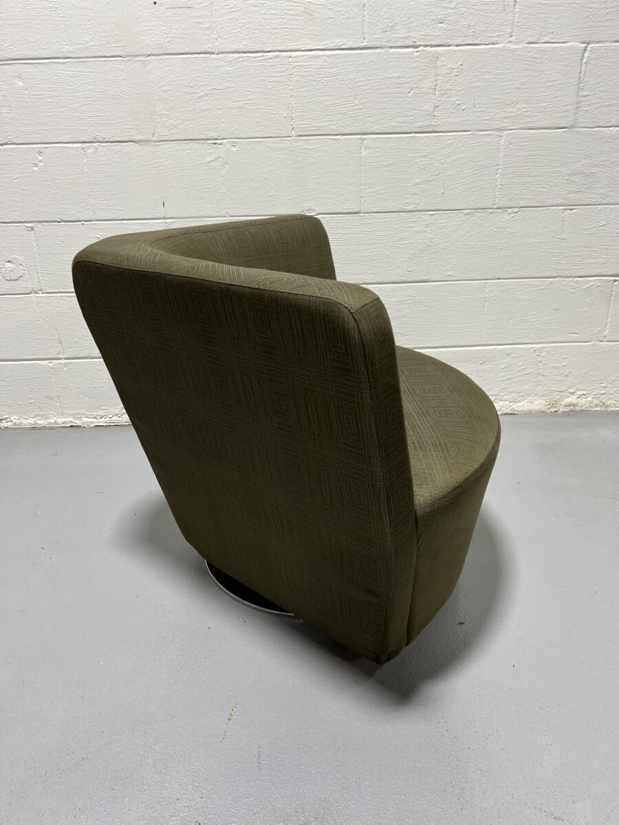 Comfortable and design-savvy Keilhauer Cahoots lounge chair in olive upholstery with a chrome swivel base. Ideal for modern offices or collaborative spaces.