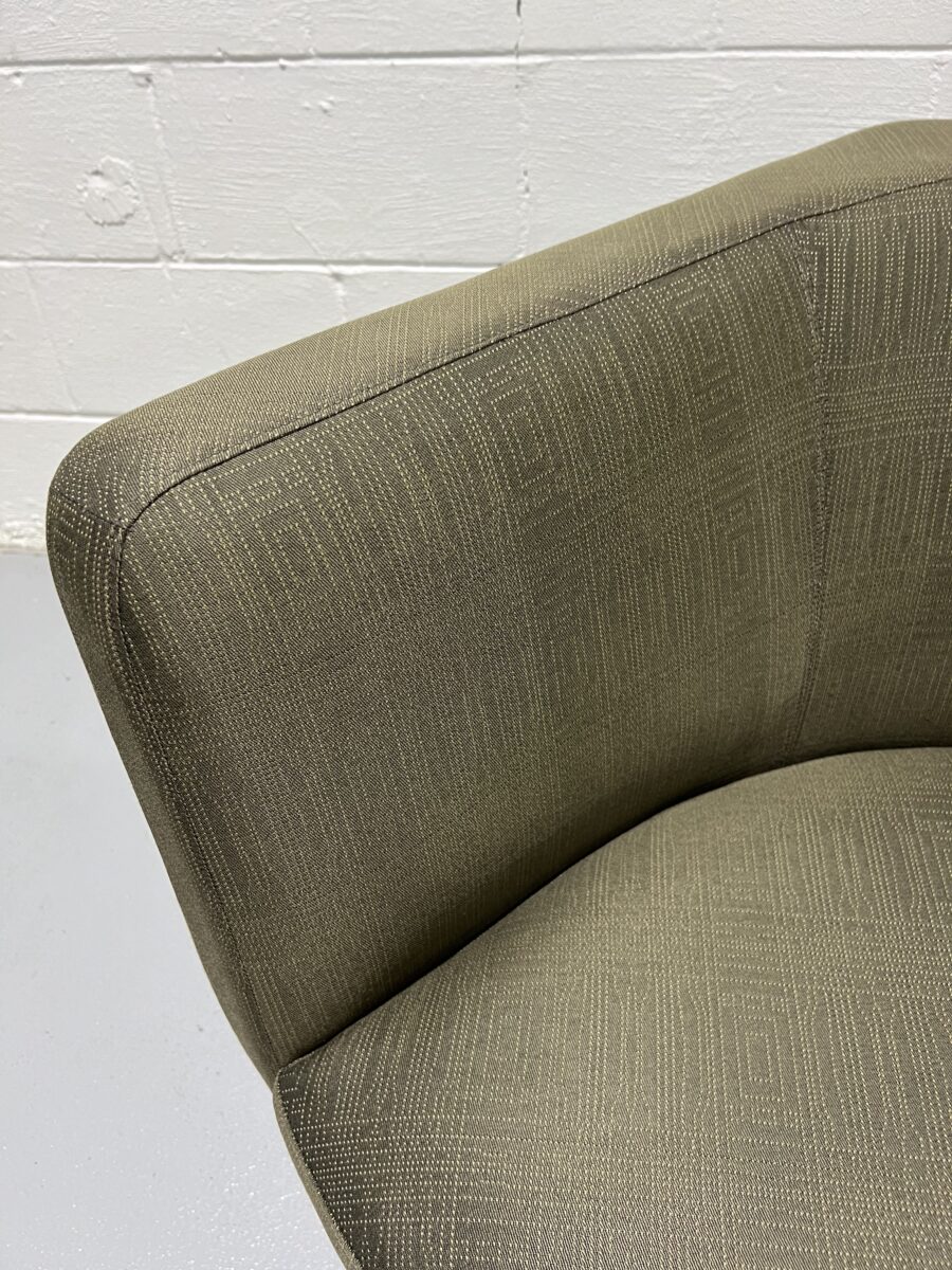 Upgrade your workspace or lounge area with this stylish Keilhauer Cahoots Swivel Lounge Chair, featuring a curved silhouette, subtle geometric-textured olive fabric, and a sturdy chrome swivel base. Designed for both comfort and design-forward collaboration, the Cahoots chair is perfect for lobbies, casual meeting areas, or residential-style breakouts. Made in Canada, this pre-owned piece offers high-end craftsmanship at a sustainable value.
