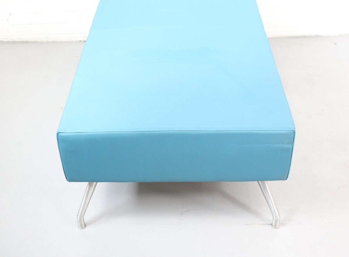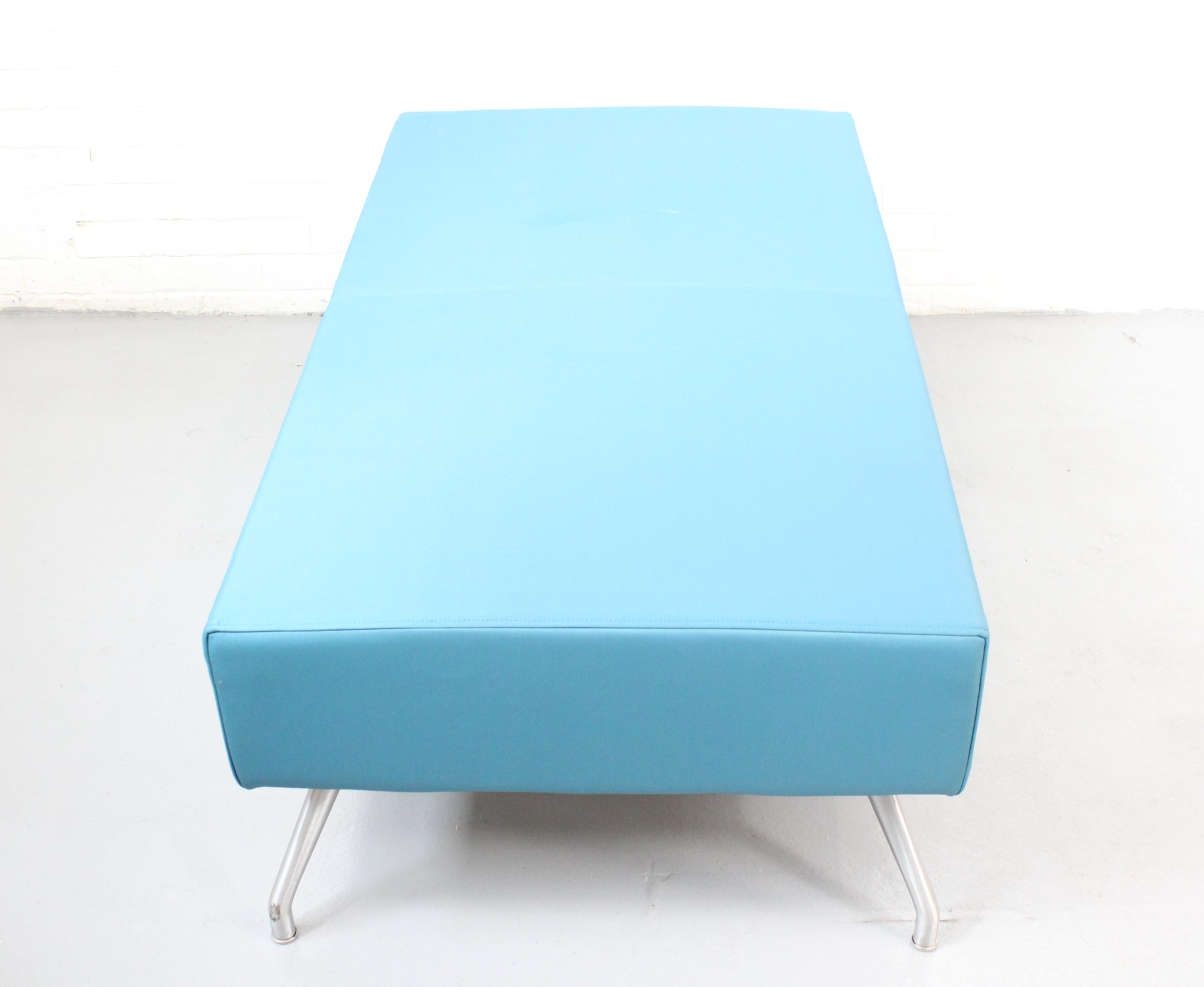 Bright blue Kimball International Pairings Bench featuring durable vinyl upholstery and sleek metal legs, ideal for modern office lounges or waiting areas.