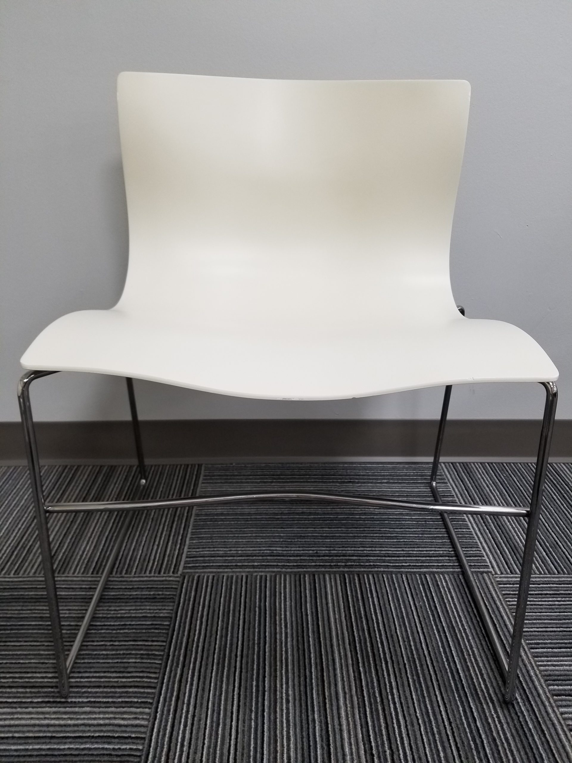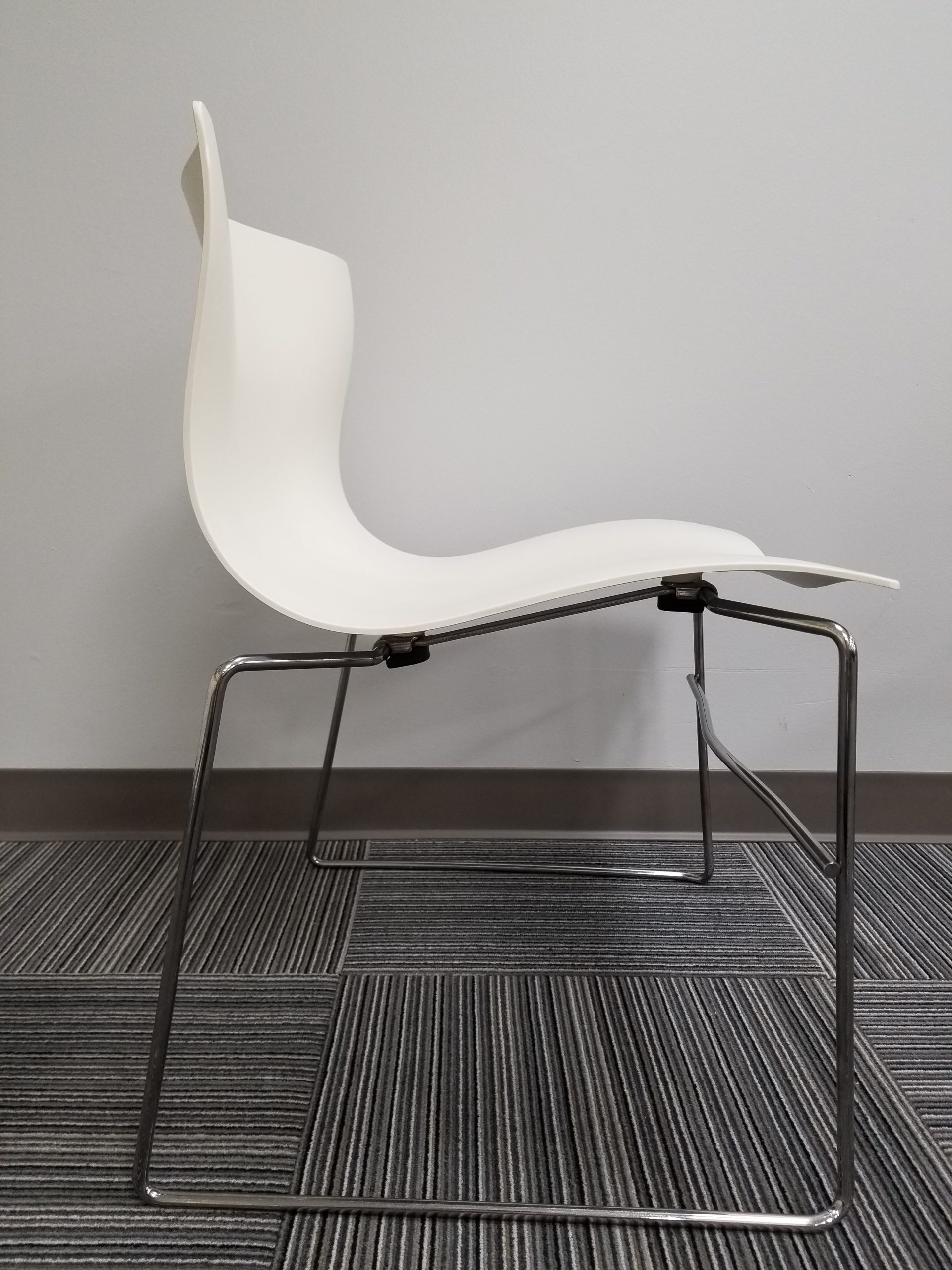 Sculptural Knoll Handkerchief Chair by Don Chadwick featuring a white molded seat and chrome sled base. Stylish, ergonomic, and modern.