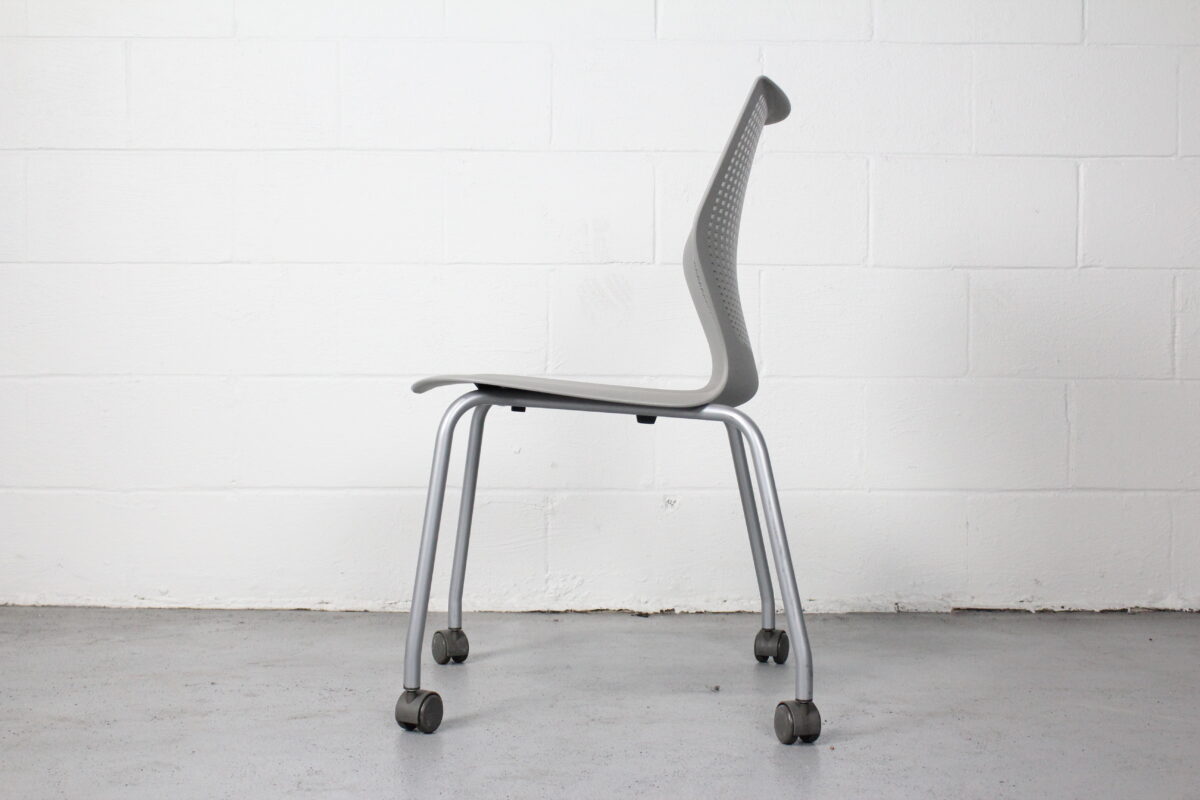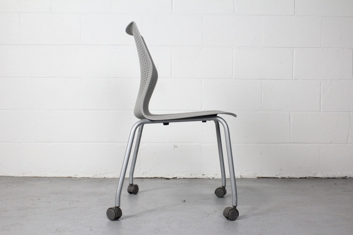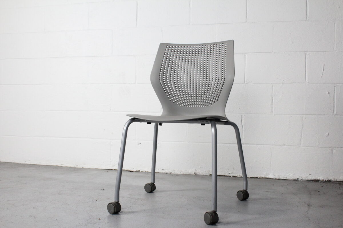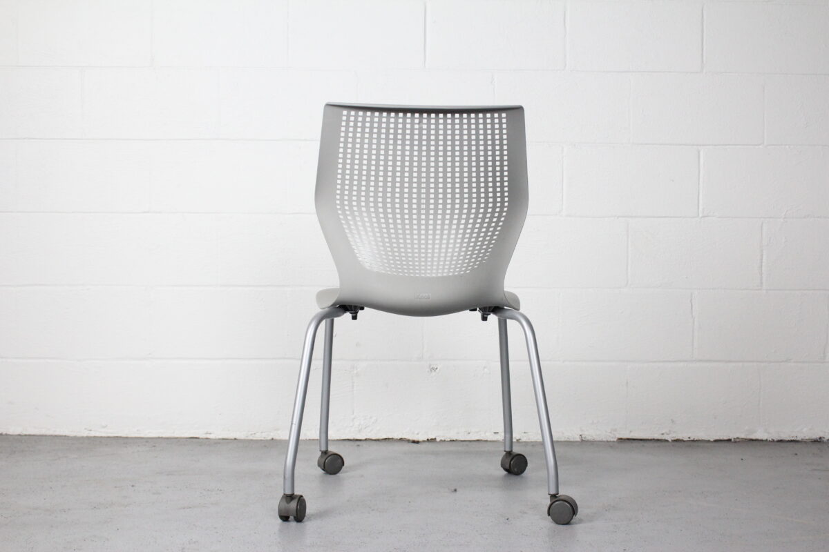 The Knoll MultiGeneration Chair redefines multipurpose seating with its dynamic flex back, perforated design, and intuitive comfort. This gray stacking chair features a lightweight yet sturdy polymer shell and casters for easy mobility, making it a favorite in modern offices, training rooms, and collaborative workspaces.