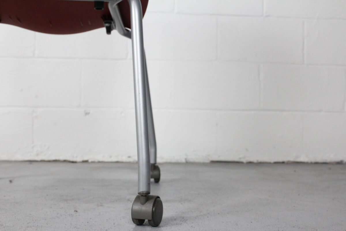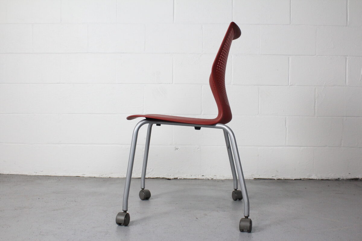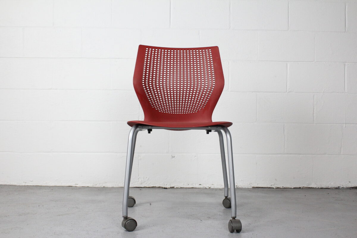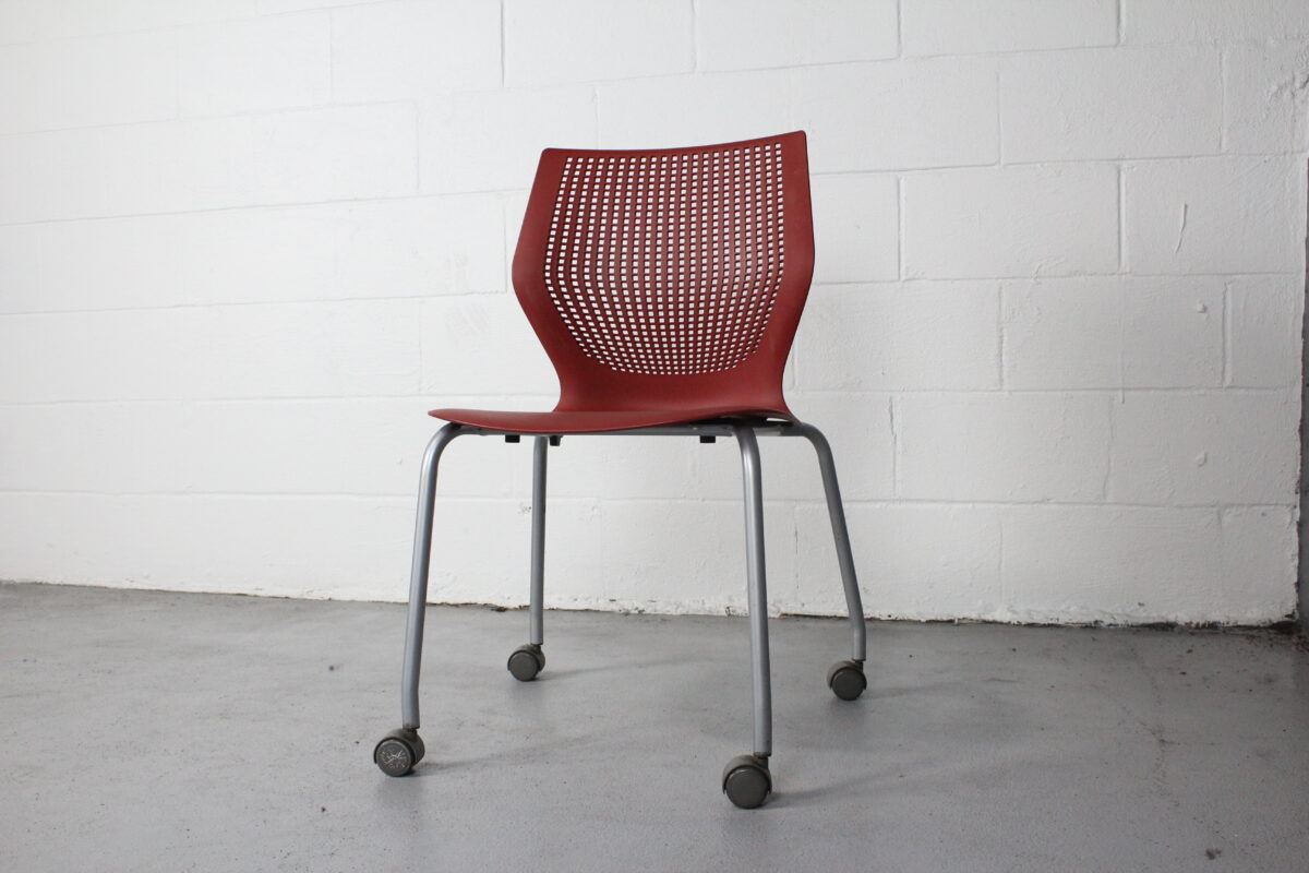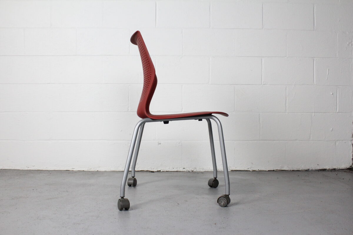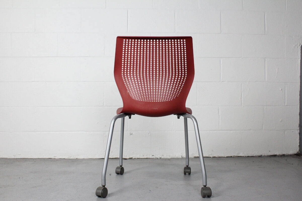 Add instant versatility to your workspace or event setup with the Knoll Multigeneration Stacking Chair in red. Designed with a flexible perforated back, ergonomic contours, and a lightweight build, this chair is all about adaptability and modern style. The silver powder-coated base is outfitted with casters for smooth mobility, and the armless profile makes for easy stacking and storage when not in use.