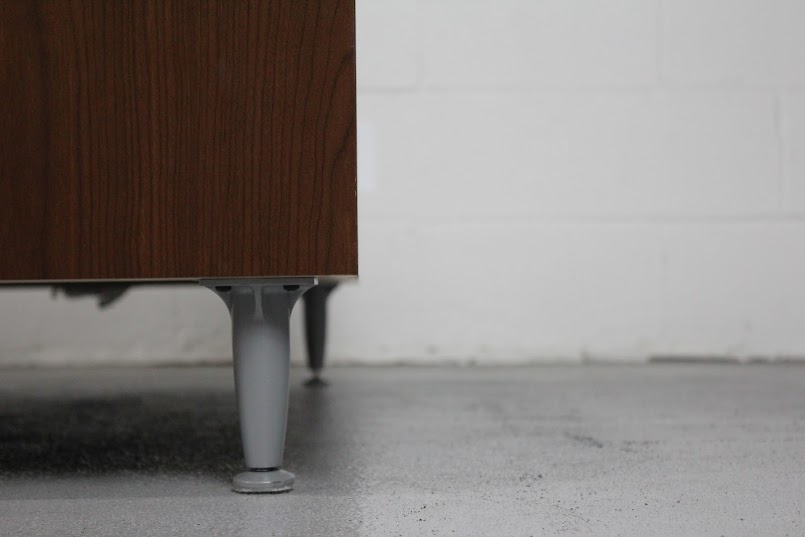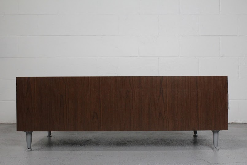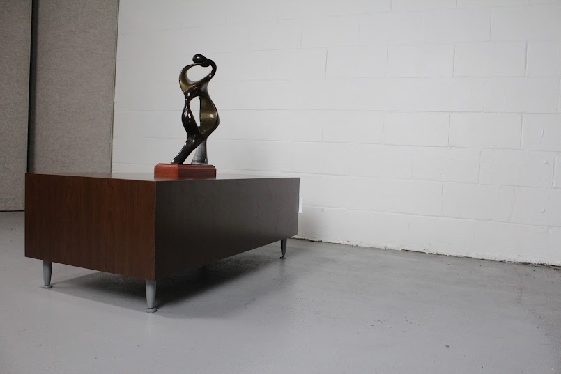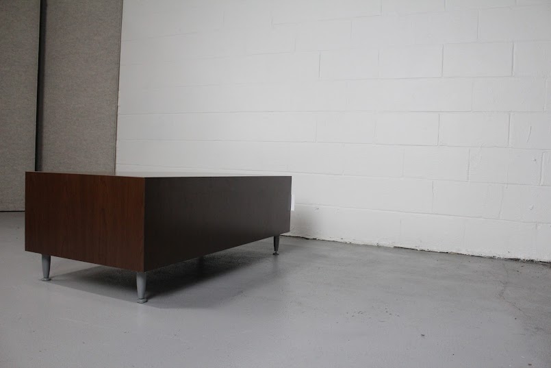 Bring warmth and clean lines to your space with this Mid-Century Modern Walnut Coffee Table. Featuring rich walnut veneer construction and tapered metal legs, this table blends minimalist form with durable functionality. Its long, low profile makes it a perfect anchor for seating areas in modern offices, waiting rooms, or residential living rooms. The walnut grain adds timeless texture, while the steel-gray legs give a subtle industrial edge — ideal for both vintage and contemporary aesthetics.
