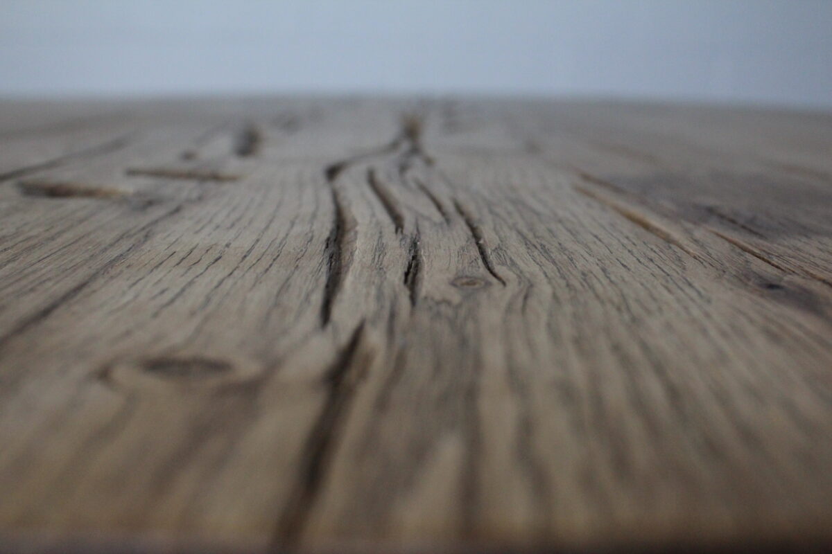48” round reclaimed wood industrial table by Oakwood Industries, supported by a black steel X-base. Perfect for meetings, dining, or collaborative spaces.
