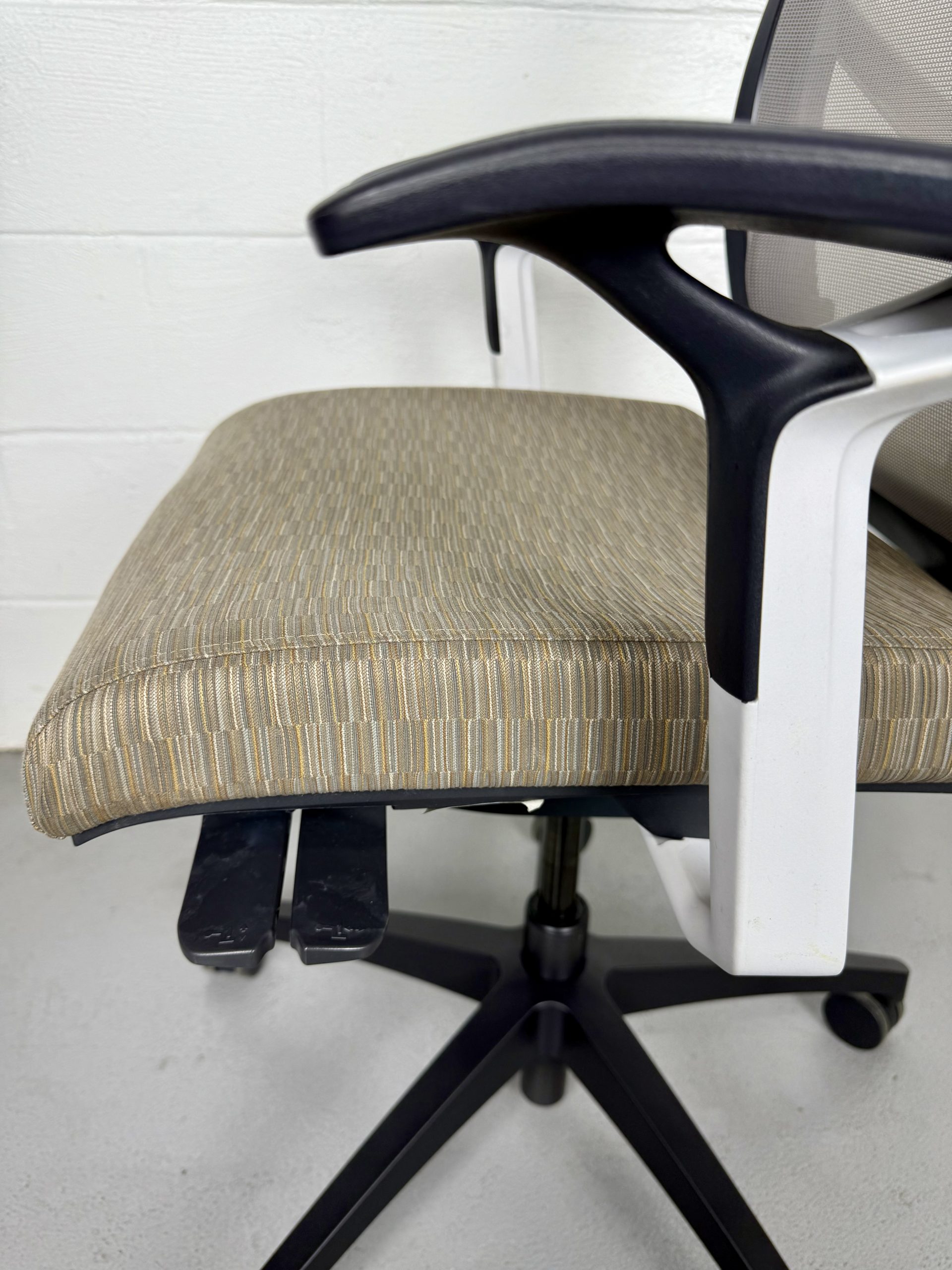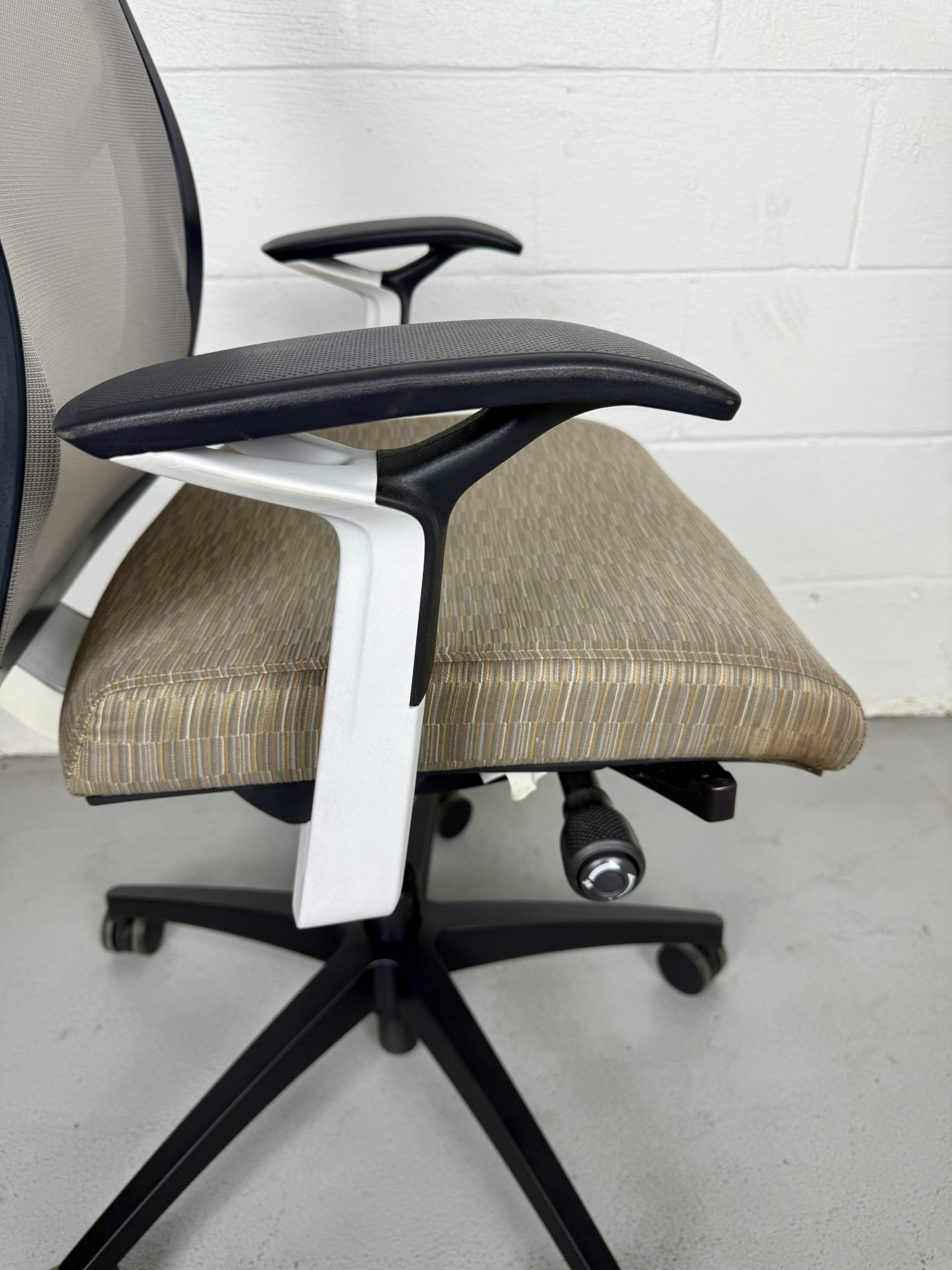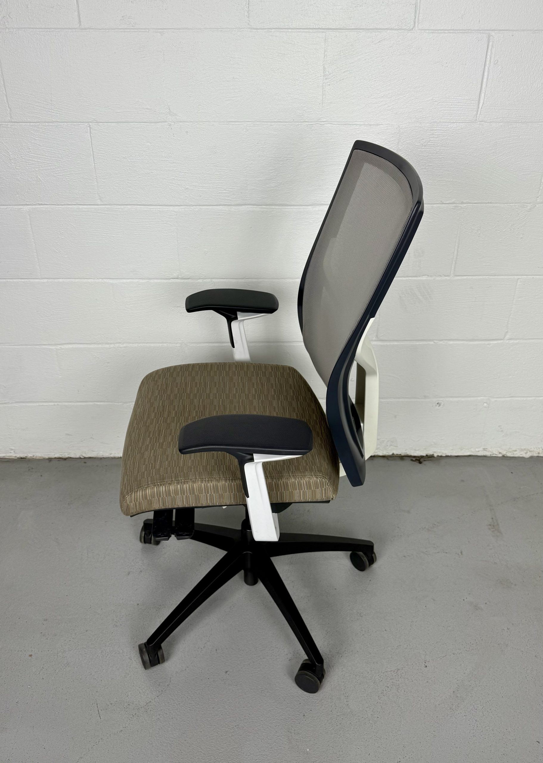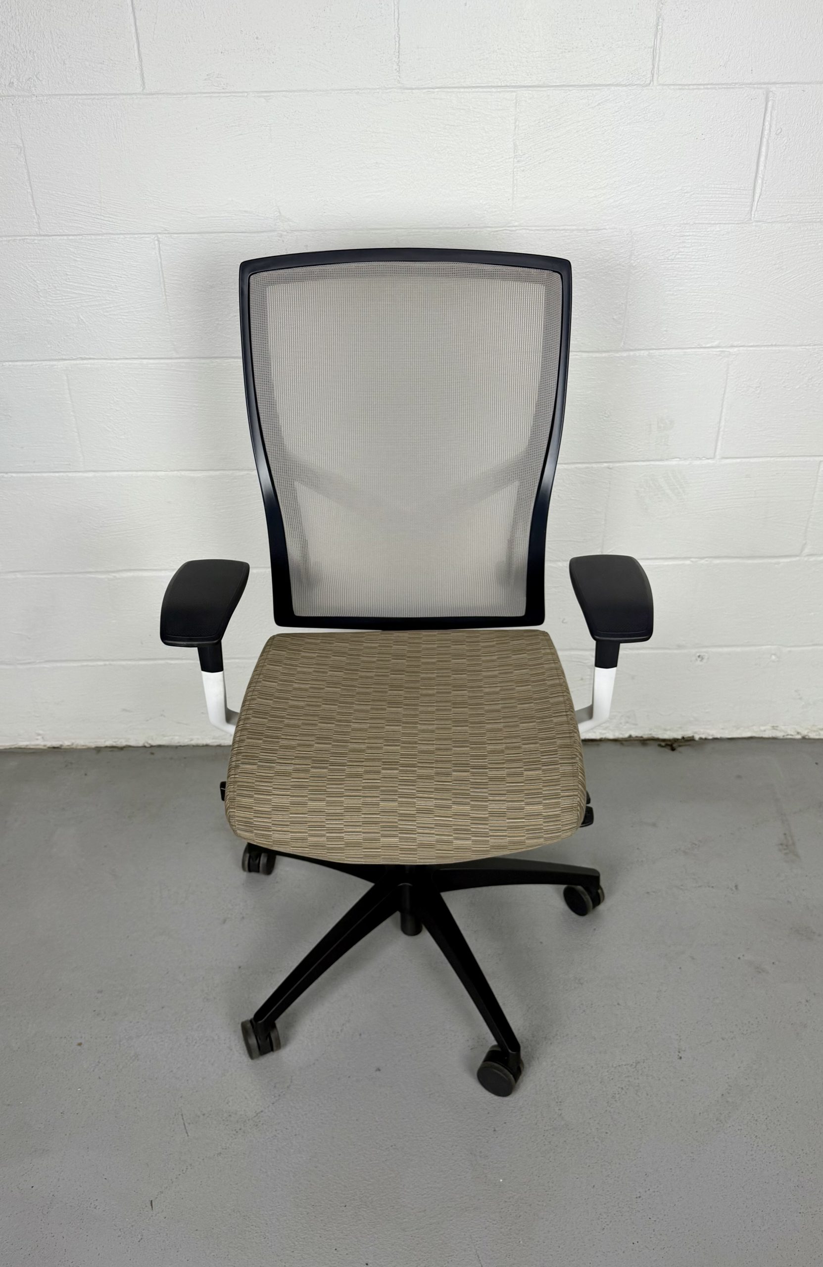 SitOnIt Torsa Series High Back Task Chair in Mesh Fog with Sandstone seat upholstery. Adjustable, ergonomic, and built for day-long comfort. Preowned and sold as-is.