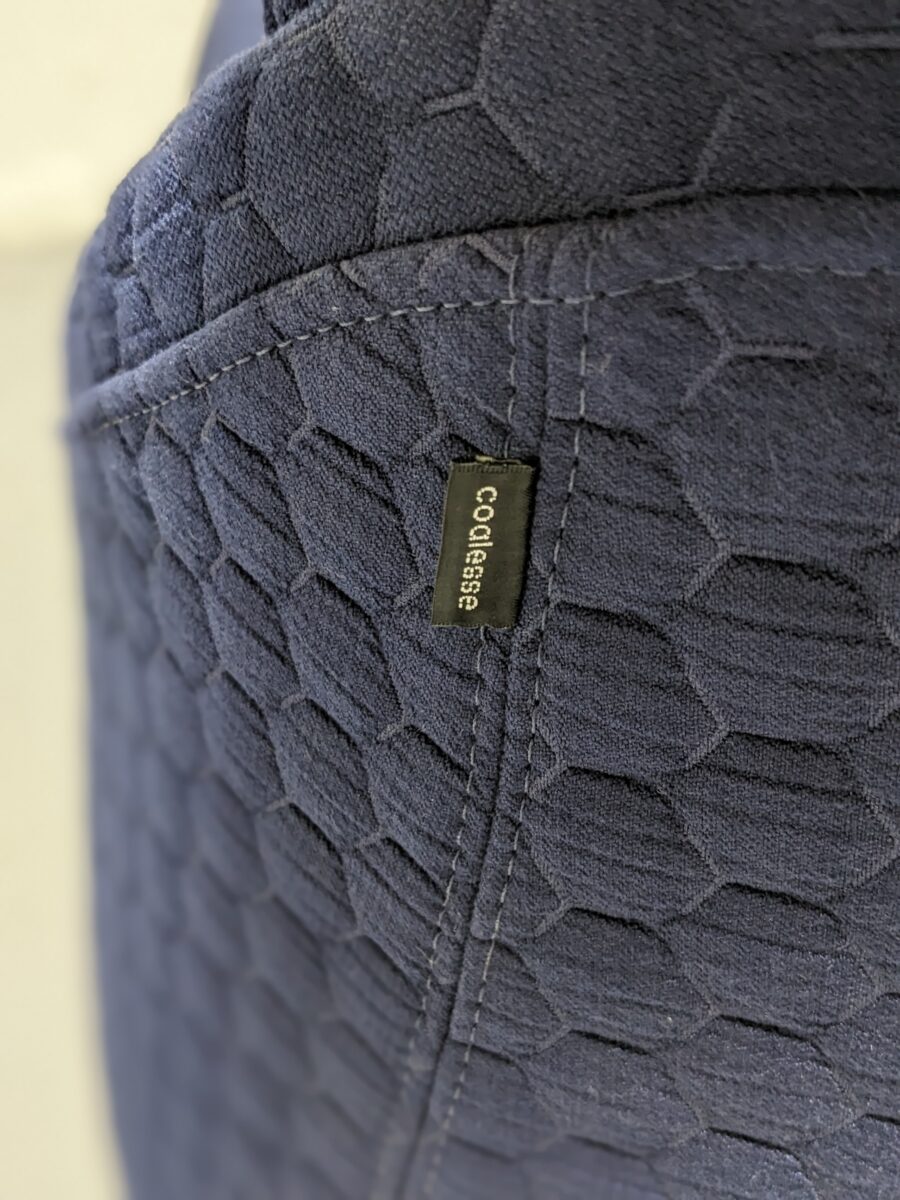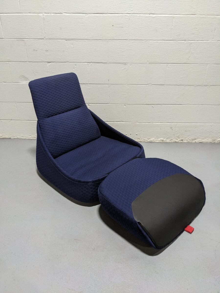 Designed for relaxed productivity, the Coalesse Hosu Lounge Chair by Steelcase blends the comfort of a lounge with the function of a work chair. Its spacious, laid-back design supports extended seating in open office lounges, reading corners, or creative studios. Upholstered in a rich quilted navy fabric with a bold red accent tag, this low-profile lounge offers both statement style and ergonomic comfort. Made with a wide, cushioned seat and gentle recline, it’s an inviting addition to any modern workspace or home office.