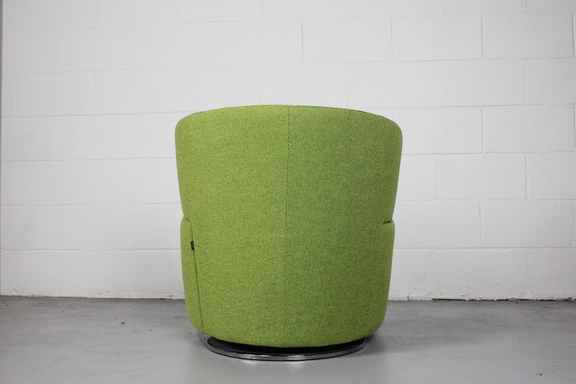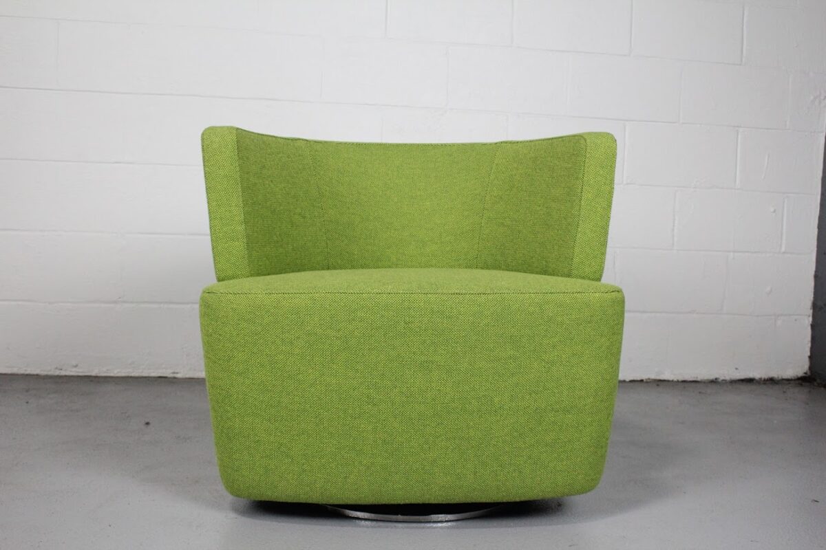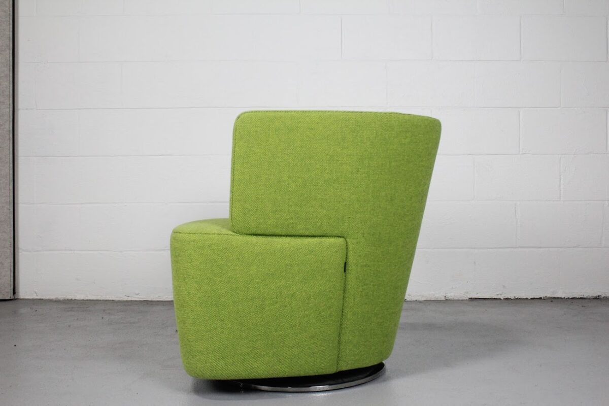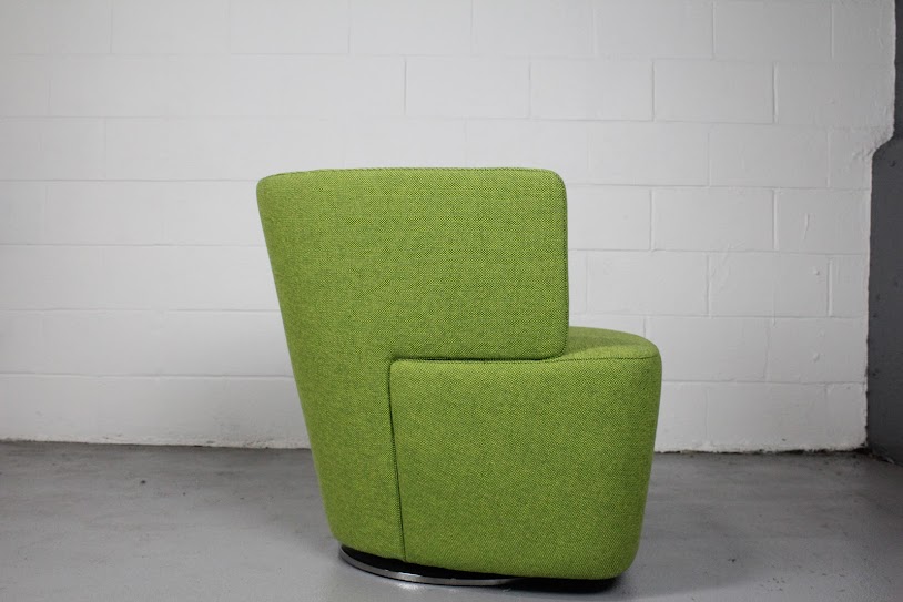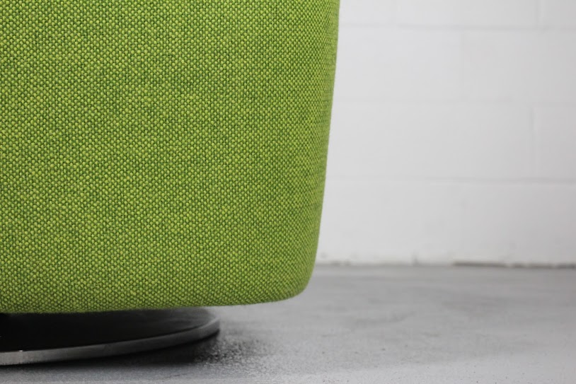 Used Steelcase Coalesse Joel Lounge Chair in green with swivel base and bold, architectural style. Preowned and sold as-is.