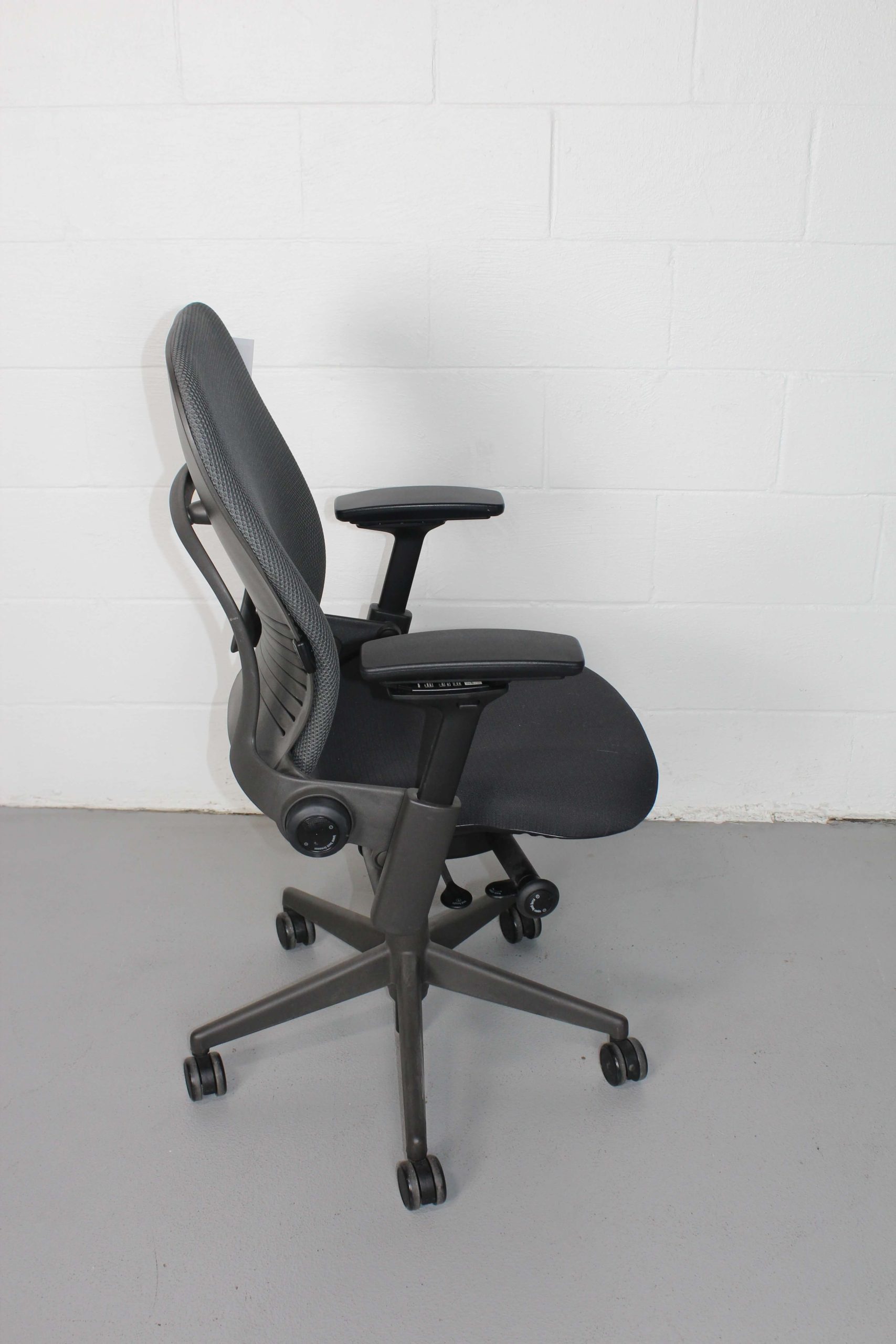 Pre-owned Steelcase Leap V2 Task Chair with 3D Knit back, black fabric seat, and fully adjustable ergonomic features.