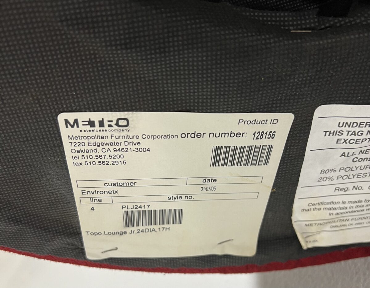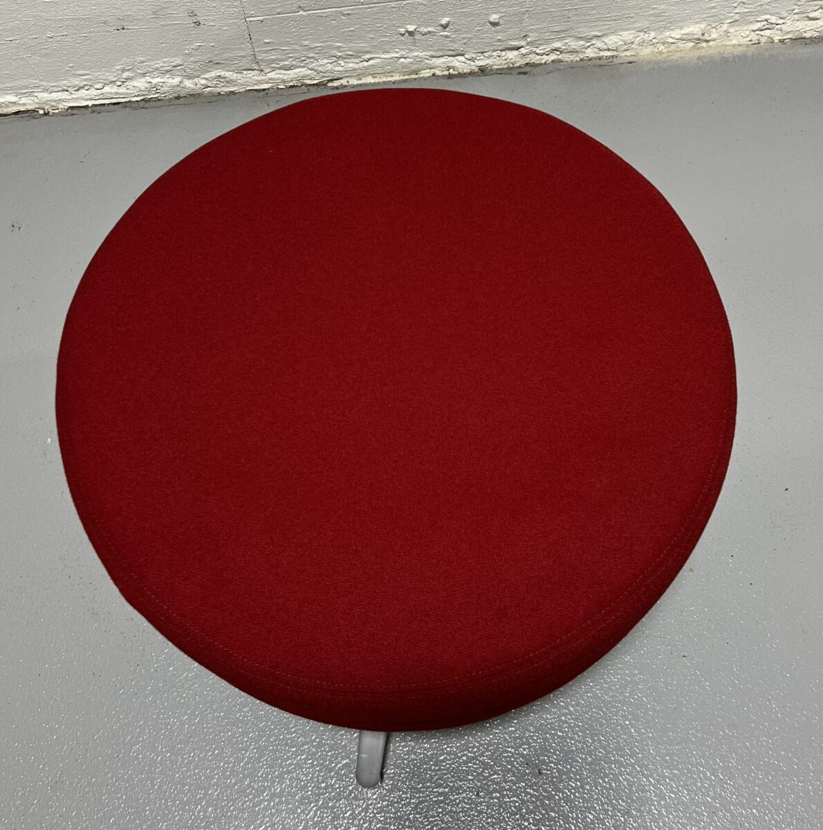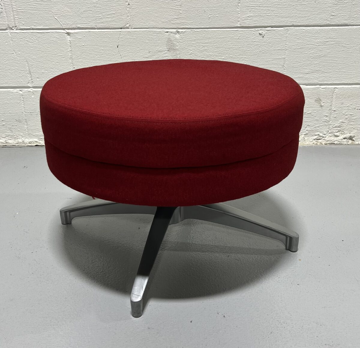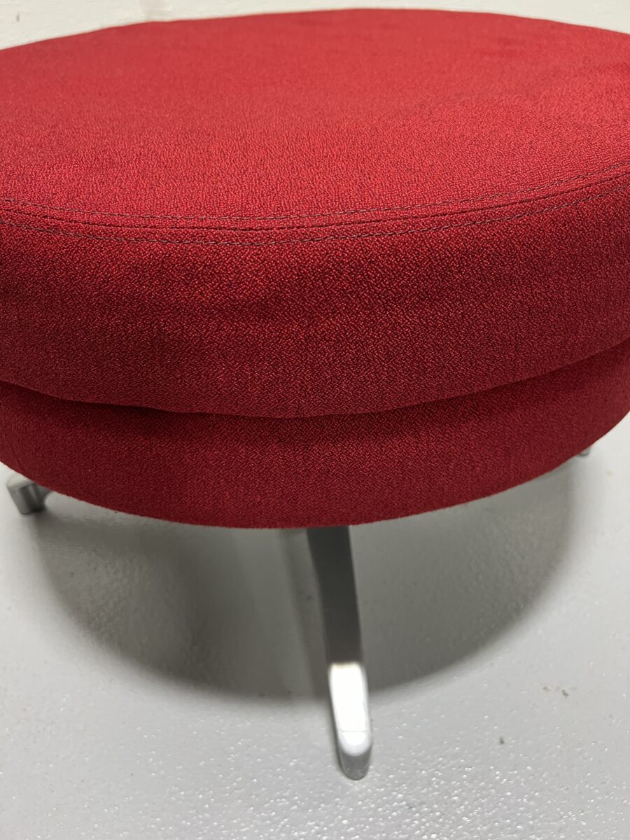 Add a bold pop of color and functional comfort to your workspace or lounge with this preowned Steelcase Metro Topo Ottoman. Upholstered in rich red fabric and crafted by Metropolitan Furniture (a Steelcase company), this round ottoman features plush cushioning and a sturdy brushed aluminum four-star base.