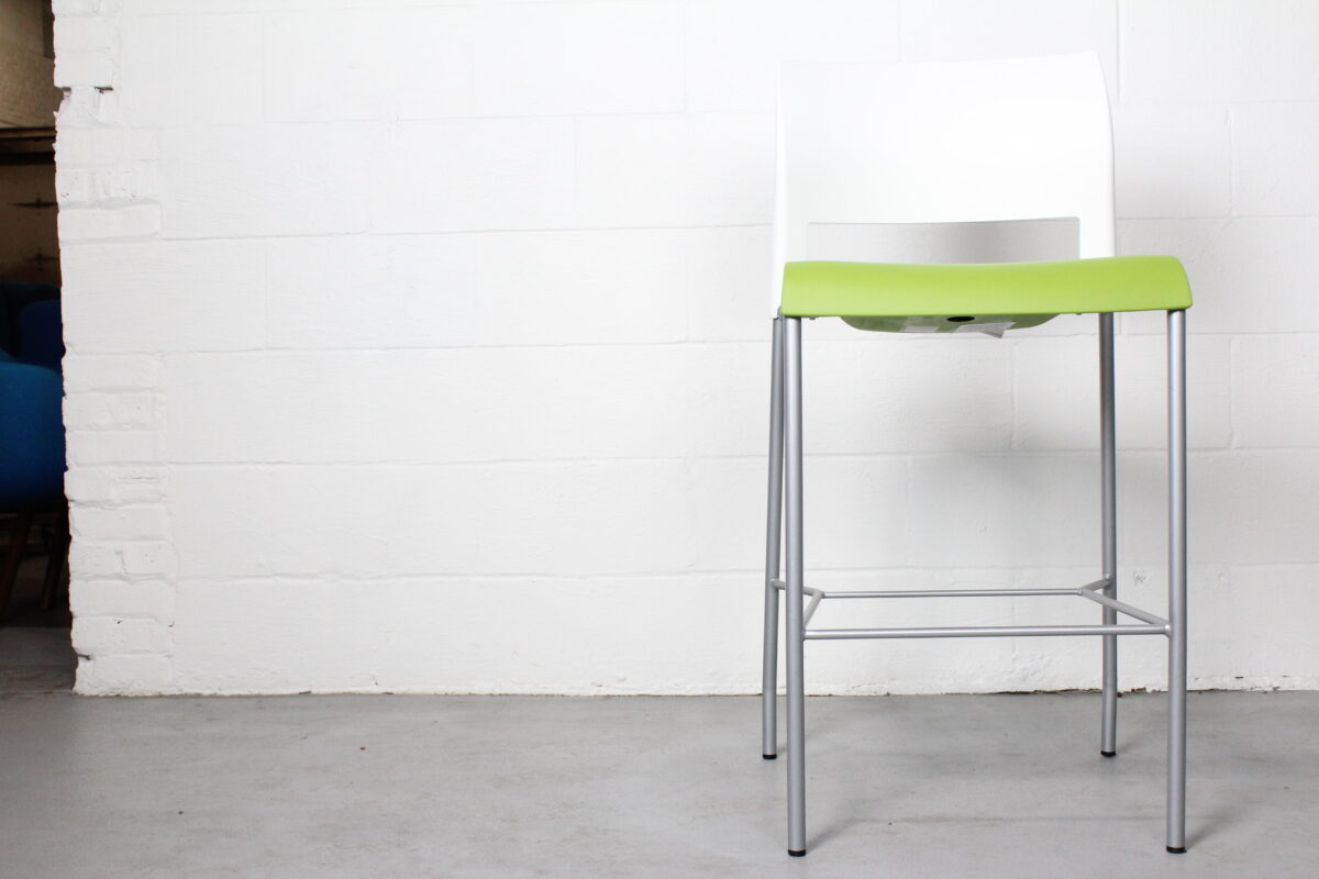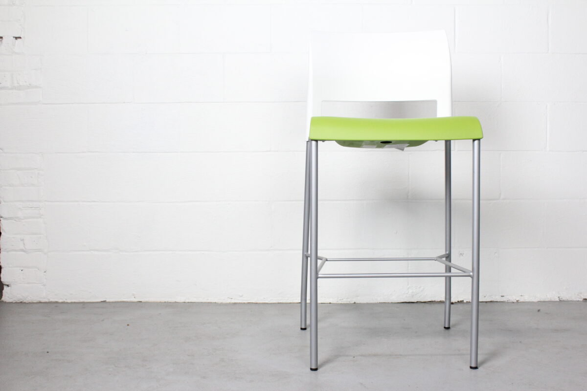 Steelcase Move Stool with green seat and white back. Modern, durable, and ideal for cafés, collaborative zones, or breakrooms.