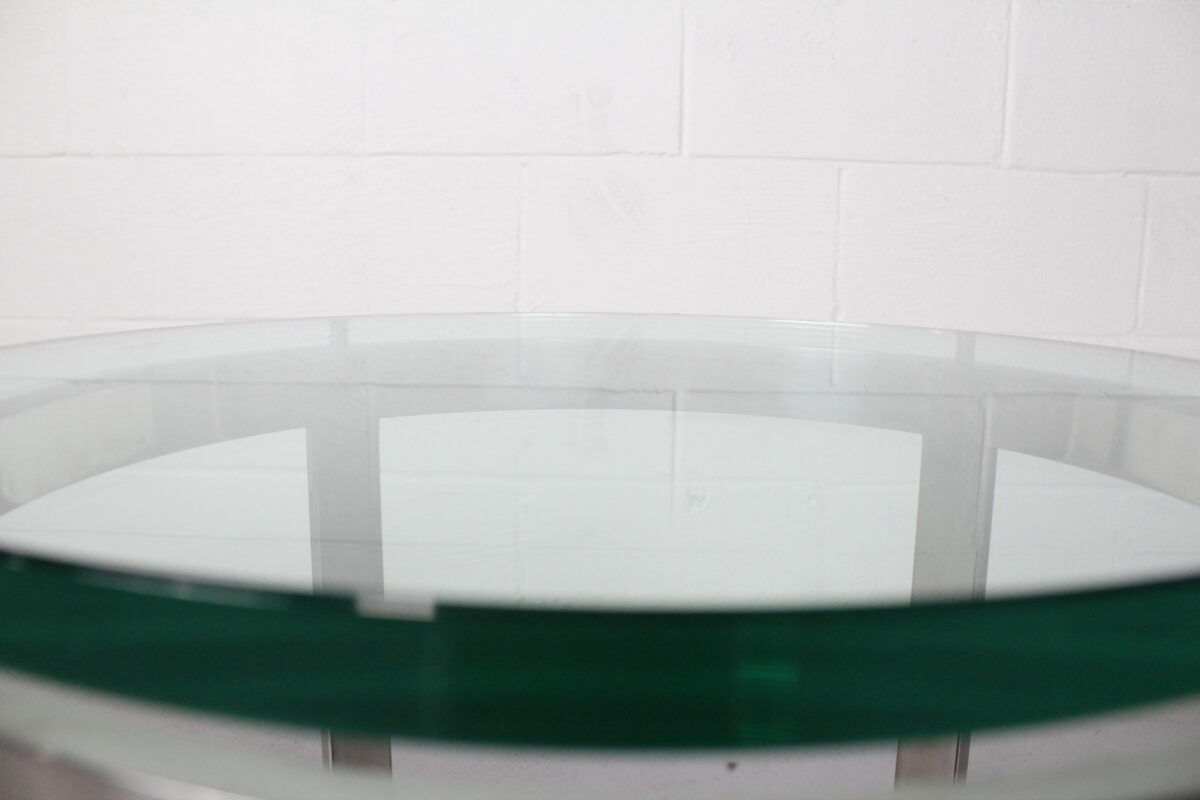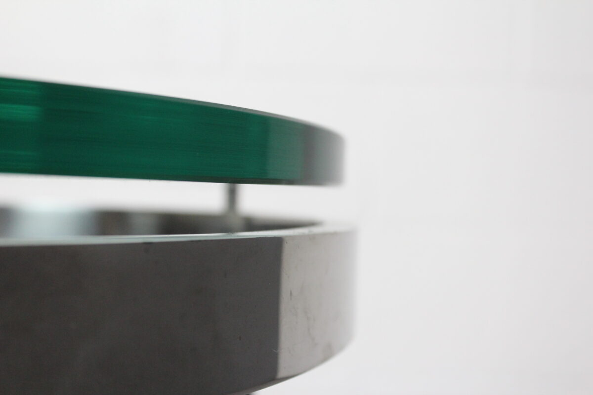 Elevate your space with the Venlo Side Table by Cumberland — a sleek, contemporary accent piece designed for high-end interiors. This distinctive table features a round green-tinted glass top set atop a brushed stainless steel base with architectural detailing. The layered edge profile offers a floating visual that adds depth and drama to any lounge or reception area.