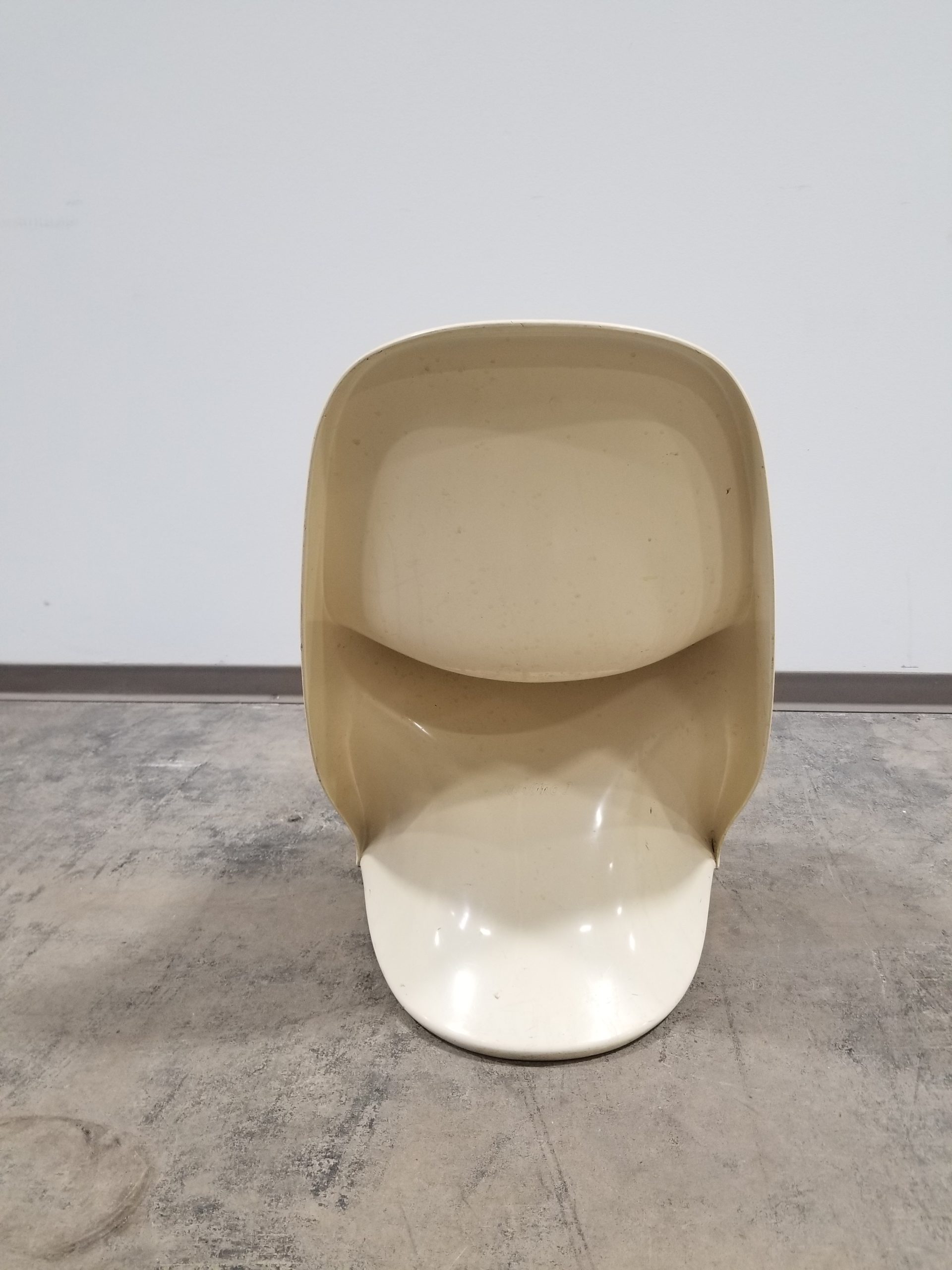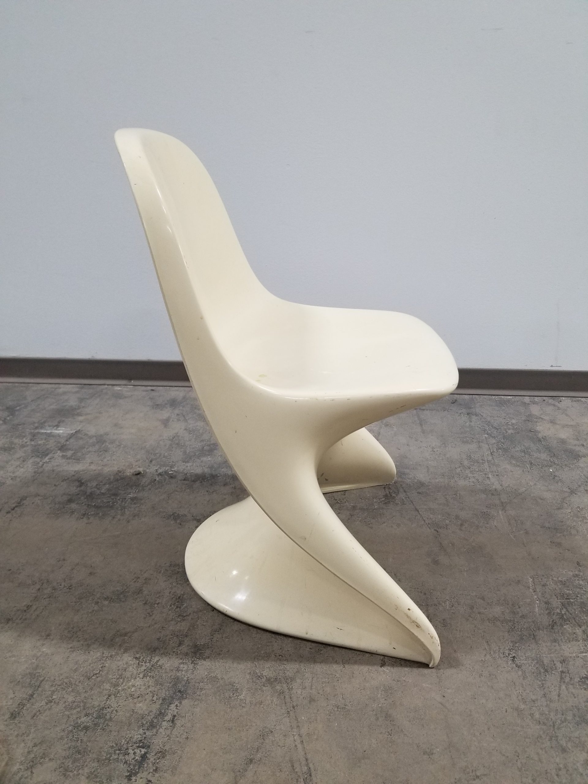 Add a pop of retro-futurism to your space with this vintage Casalino Chair by Casala, a true icon of 1970s space age design. Molded in durable ivory plastic, this sculptural chair features a continuous flowing form that doubles as both art and function. Stackable and versatile, it’s perfect for stylish dining, bold office seating, or a design-forward accent piece. Some wear consistent with age; sold as-is.
